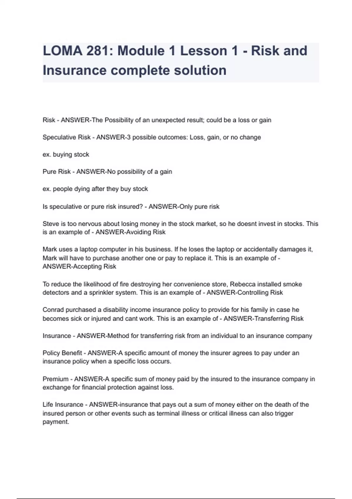 LOMA 281: Module 1 Lesson 1 - Risk and Insurance complete solution