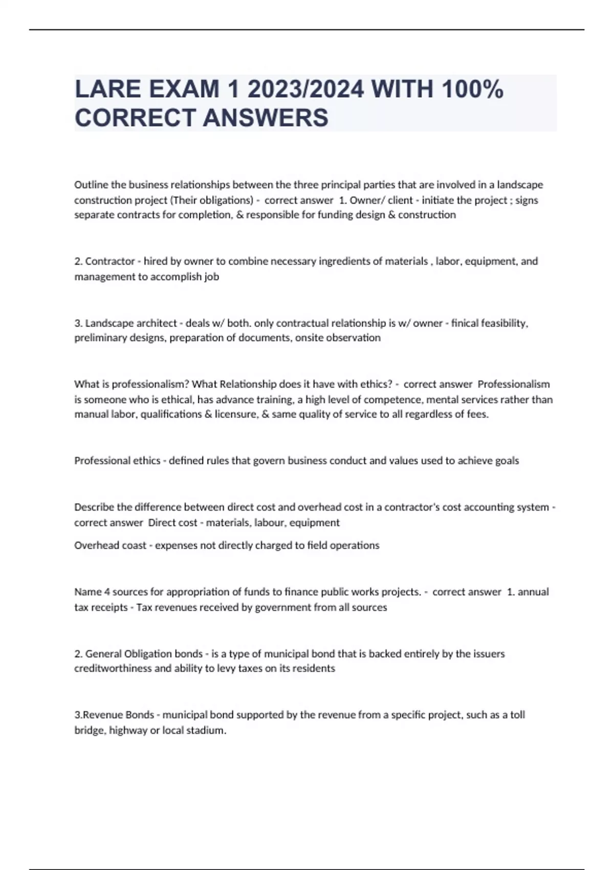 Outline the business relationships between the three principal parties that are involved in a landscape construction project (Their obligations) - correct answer 1. Owner/ client - initiate the project ; signs separate contracts for completion, & responsible for funding design & construction 2. Contractor - hired by owner to combine necessary ingredients of materials , labor, equipment, and management to accomplish job 3. Landscape architect - deals w/ both. only contractual relationship is w/ owner - finical feasibility, preliminary designs, preparation of documents, onsite observation What is professionalism? What Relationship does it have with ethics? - correct answer Professionalism is someone who is ethical, has advance training, a high level of competence, mental services rather than manual labor, qualifications & licensure, & same quality of service to all regardless of fees. Professional ethics - defined rules that govern business conduct and values used to achieve goals Describe the difference between direct cost and overhead cost in a contractor's cost accounting system - correct answer Direct cost - materials, labour, equipment Overhead coast - expenses not directly charged to field operations Name 4 sources for appropriation of funds to finance public works projects. - correct answer 1. annual tax receipts - Tax revenues received by government from all sources 2. General Obligation bonds - is a type of municipal bond that is backed entirely by the issuers creditworthiness and ability to levy taxes on its residents 3.Revenue Bonds - municipal bond supported by the revenue from a specific project, such as a toll bridge, highwa