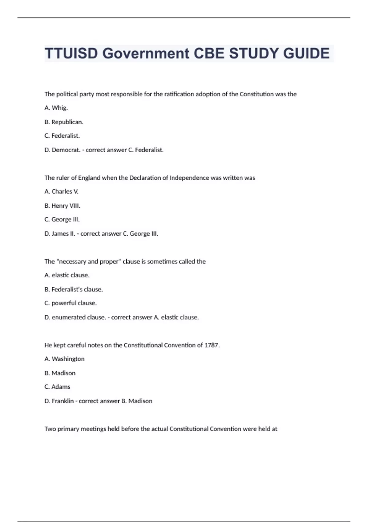TTUISD Government CBE STUDY GUIDE Question and answers 2023/2024 verified to passThe political party most responsible for the ratification adoption of the Constitution was the A. Whig. B. Republican. C. Federalist. D. Democrat. - correct answer C. Federalist. The ruler of England when the Declaration of Independence was written was A. Charles V. B. Henry VIII. C. George III.