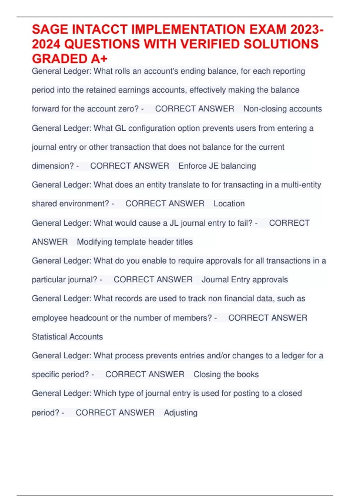 SAGE INTACCT IMPLEMENTATION EXAM 2023- 2024 QUESTIONS WITH VERIFIED SOLUTIONS GRADED A+ General Ledger: What rolls an account's ending balance, for each reporting period into the retained earnings accounts, effectively making the balance forward for the account zero? - CORRECT ANSWER Non-closing accounts General Ledger: What GL configuration option prevents users from entering a journal entry or other transaction that does not balance for the current dimension? - CORRECT ANSWER Enforce JE balancing General Ledger: What does an entity translate to for transacting in a multi-entity shared environment? - CORRECT ANSWER Location General Ledger: What would cause a JL journal entry to fail? - CORRECT ANSWER Modifying template header titles General Ledger: What do you enable to require approvals for all transactions in a particular journal? - CORRECT ANSWER Journal Entry approvals General Ledger: What records are used to track non financial data, such as employee headcount or the number of members? - CORRECT ANSWER Statistical Accounts General Ledger: What process prevents entries and/or changes to a ledger for a specific period? - CORRECT ANSWER Closing the books General Ledger: Which type of journal entry is used for posting to a closed period? - CORRECT ANSWER Adjusting SAGE INTACCT IMPLEMENTATION EXAM 2023- 2024 QUESTIONS WITH VERIFIED SOLUTIONS GRADED A+ Purchasing: What enables to categorize items for the purpose of posting to specific GL Accounts when using Advanced Workflows in the purchasing application? - CORRECT ANSWER Item GL Group Purchasing: PO for a certain qty of item, need to pay for lesser qty. What setting in the PO transaction definition controls how you would process this transaction? - CORRECT ANSWER Partial Conversion Handling Purchasing: What dimension represents goods or services purchased from a vendor? - CORRECT ANSWER Item Purchasing: How does the system determine what type of transactions require aproval, what approvals are required, and the sequence of approvals? - CORRECT ANSWER Approval Policies Purchasing: What transaction definition setting requires at least one debit/credit account pair defined? - CORRECT ANSWER Transaction Posting set to Accounts Payable Accounts Receivables: What would you view to see all of the following information: customer