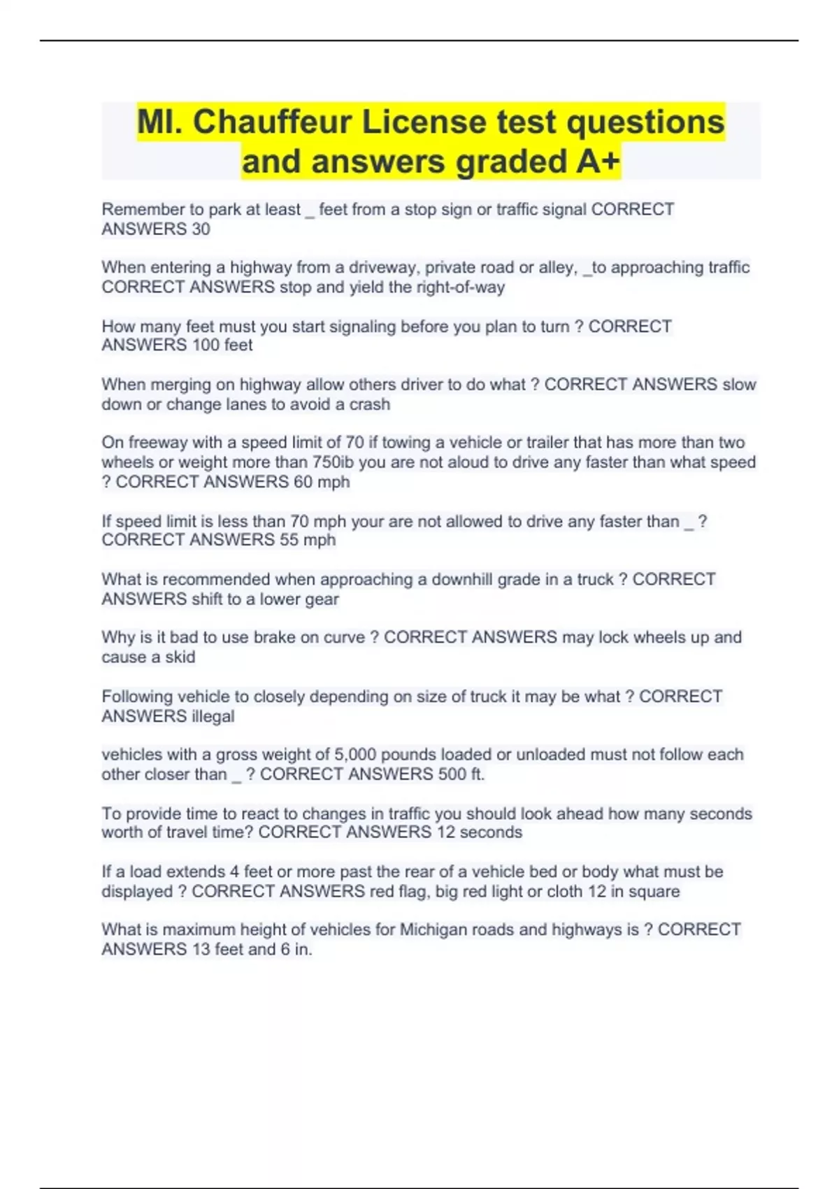 MI. Chauffeur License test questions and answers graded A+