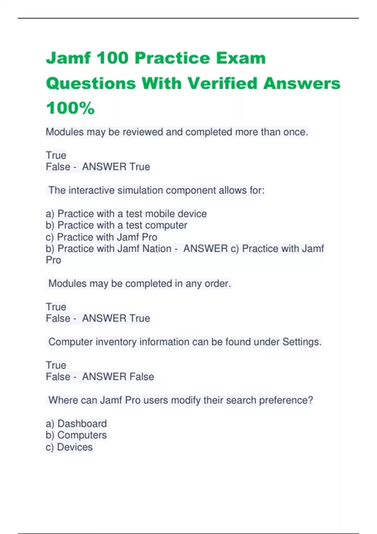 Jamf 100 Practice Exam Questions With Verified Answers 100% Modules may be reviewed and completed more than once. True False - ANSWER True The interactive simulation component allows for: a) Practice with a test mobile device b) Practice with a test computer c) Practice with Jamf Pro b) Practice with Jamf Nation - ANSWER c) Practice with Jamf Pro Modules may be completed in any order. True False - ANSWER True Computer inventory information can be found under Settings. True False - ANSWER False Where can Jamf Pro users modify their search preference? a) Dashboard b) Computers c) Devices d) Account Settings - ANSWER d) Account Settings Which Jamf Pro app allows for the building of packaged for distribution? a) Composer b) Jamf Admin c) Jamf Remote d) Jamf Imaging - ANSWER a) Composer ____ is required to complete iOS Setup Assistant a) Supervision b) Apple ID c) Activation d) Automated Device Enrollment - ANSWER c) Activation The _____ app contains detailed information about an iOS device a) Tips b) Settings c) Mail d) Photos - ANSWER b) Settings To delete an app from an iOS device: a) Tap and hold the app until a menu pops up and tap "Delete App". b) Navigate to Settings > General > App list c) Secondary click on the app and click "Remove". d) Apps cannot be deleted on iOS devices. - ANSWER a) Tap and hold the app until a menu pops up and tap "Delete App". The name of an iOS device can be found by navigating to Settings > General > _____. a) Device Name b) Accessibility c) About d) Reset - ANSWER c) About When downloading a paid app from the App Store, what will the download button say? a) GET b) BUY c) PAID d) The price of the app - ANSWER d) The price of the app By default, iOS devices require that a passc