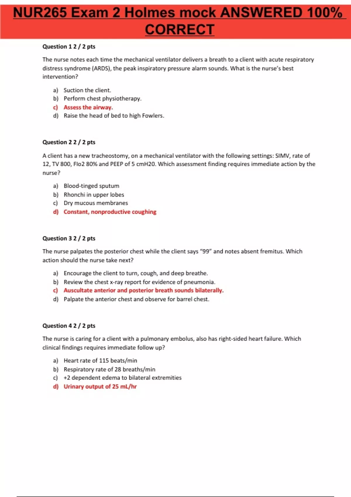 Question 1 2 / 2 pts The nurse notes each time the mechanical ventilator delivers a breath to a client with acute respiratory distress syndrome (ARDS), the peak inspiratory pressure alarm sounds. What is the nurse’s best intervention? a) Suction the client. b) Perform chest physiotherapy. c) Assess the airway. d) Raise the head of bed to high Fowlers. Question 2 2 / 2 pts A client has a new tracheostomy, on a mechanical ventilator with the following settings: SIMV, rate of 12, TV 800, FIo2 80% and PEEP of 5 cmH20. Which assessment finding requires immediate action by the nurse? a) Blood-tinged sputum b) Rhonchi in upper lobes c) Dry mucous membranes d) Constant, nonproductive coughing Question 3 2 / 2 pts The nurse palpates the posterior chest while the client says “99” and notes absent fremitus. Which action should the nurse take next? a) Encourage the client to turn, cough, and deep breathe. b) Review the chest x-ray report for evidence of pneumonia. c) Auscultate anterior and posterior breath sounds bilaterally. d) Palpate the anterior chest and observe for barrel chest. Question 4 2 / 2 pts The nurse is caring for a client with a pulmonary embolus, also has right-sided heart failure. Which clinical findings requires immediate follow up? a) Heart rate of 115 beats/min b) Respiratory rate of 28 breaths/min c) +2 dependent edema to bilateral extremities d) Urinary output of 25 mL/hr