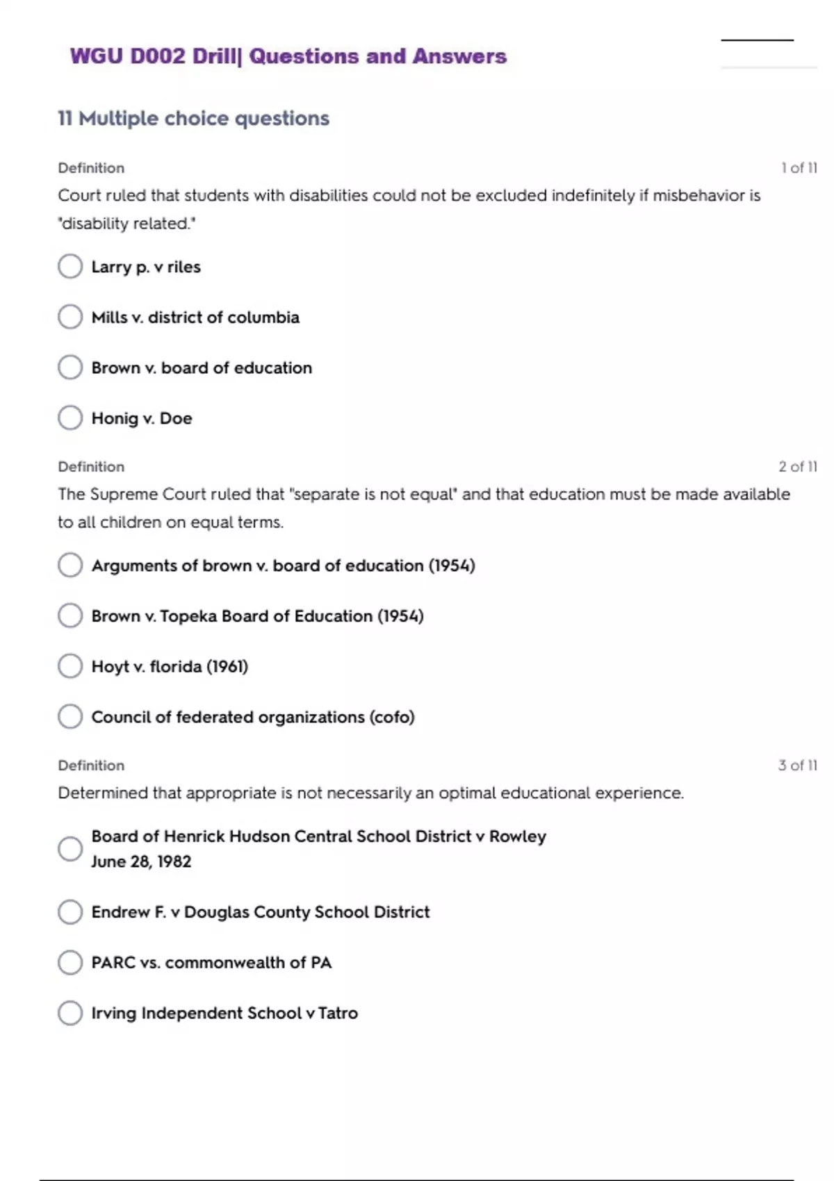 WGU D002 Drill| Questions and Answers Court ruled that students with disabilities could not be excluded indefinitely if misbehavior is "disability related."