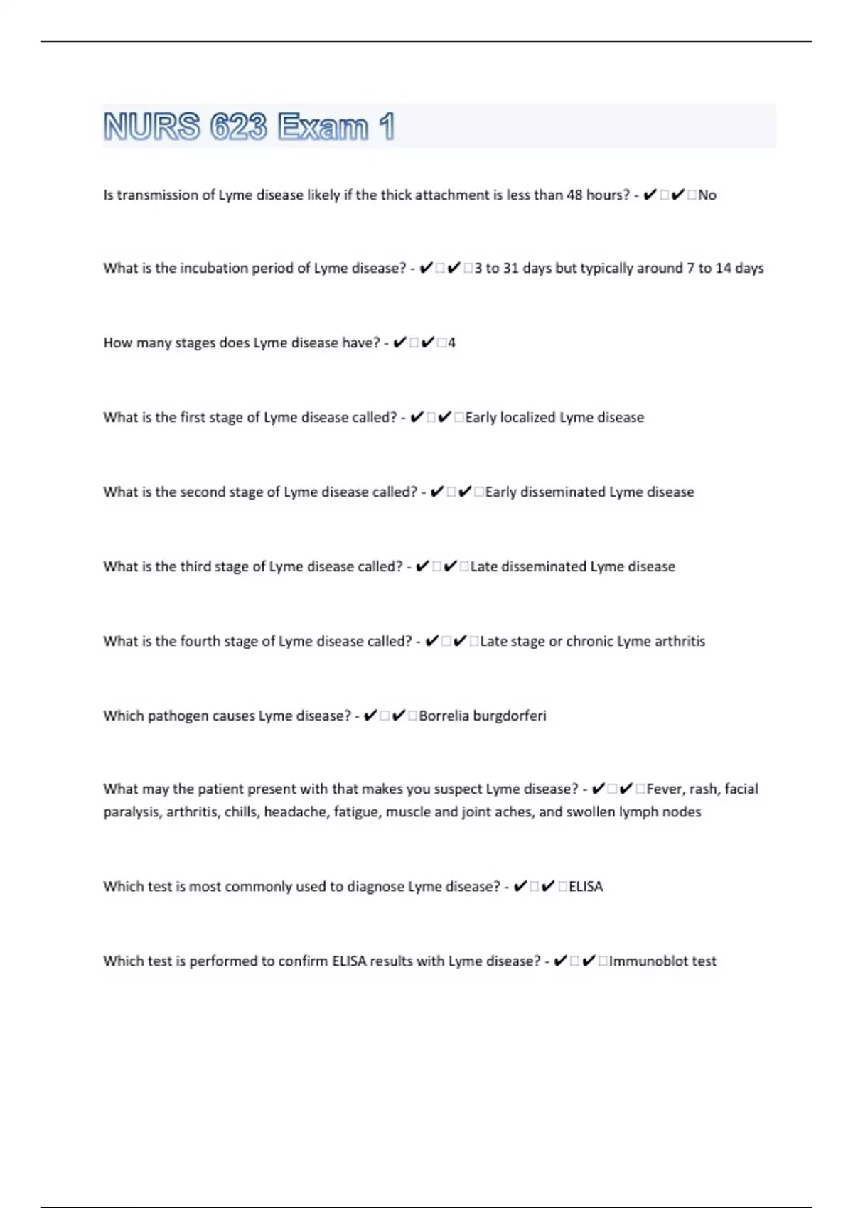 Is transmission of Lyme disease likely if the thick attachment is less than 48 hours? - ️️No What is the incubation period of Lyme disease? - ️️3 to 31 days but typically around 7 to 14 days How many stages does Lyme disease have? - ️️4 What is the first stage of Lyme disease called? - ️️Early localized Lyme disease What is the second stage of Lyme disease called? - ️️Early disseminated Lyme disease What is the third stage of Lyme disease called? - ️️Late disseminated Lyme disease What is the fourth stage of Lyme disease called? - ️️Late stage or chronic Lyme arthritis Which pathogen causes Lyme disease? - ️️Borrelia burgdorferi What may the patient present with that makes you suspect Lyme disease? - ️️Fever, rash, facial paralysis, arthritis, chills, headache, fatigue, muscle and joint aches, and swollen lymph nodes Which test is most commonly used to diagnose Lyme disease? - ️️ELISA Which test is performed to confirm ELISA results with Lyme disease? - ️️Immunoblot test