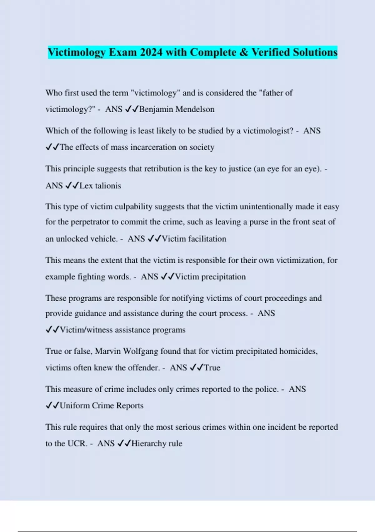 Victimology Exam 2024 with Complete & Verified Solutions Who first used the term "victimology" and is considered the "father of victimology?" - ANS ️️ Benjamin Mendelson Which of the following is least likely to be studied by a victimologist? - ANS ️️ The effects of mass incarceration on society This principle suggests that retribution is the key to justice (an eye for an eye). - ANS ️️ Lex talionis This type of victim culpability suggests that the victim unintentionally made it easy for the perpetrator to commit the crime, such as leaving a purse in the front seat of an unlocked vehicle. - ANS ️️ Victim facilitation This means the extent that the victim is responsible for their own victimization, for example fighting words. - ANS ️️ Victim precipitation These programs are responsible for notifying victims of court proceedings and provide guidance and assistance during the court process. - ANS ️️ Victim/witness assistance programs True or false, Marvin Wolfgang found that for victim precipitated homicides, victims often knew the offender. - ANS ️️ True This measure of crime includes only crimes reported to the police. - ANS ️️ Uniform Crime Reports This rule requires that only the most serious crimes within one incident be reported to the UCR. - ANS ️️ Hierarchy rule