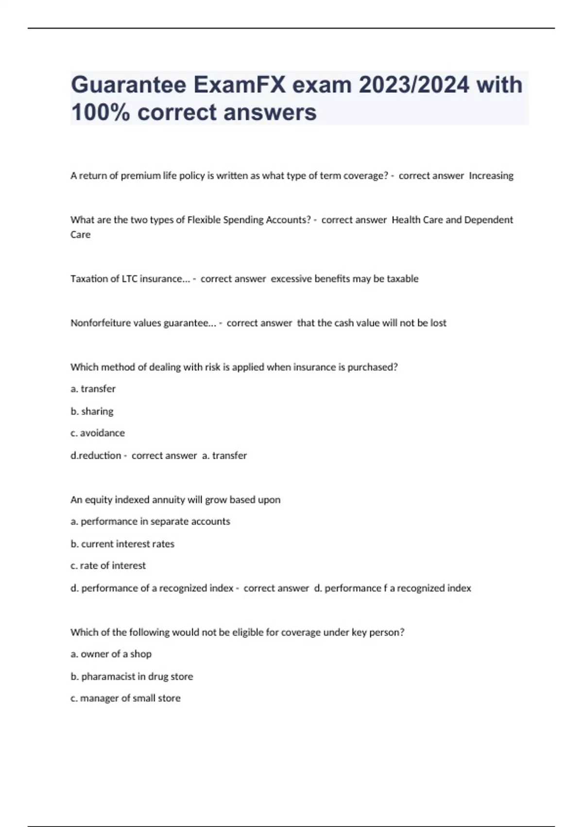A return of premium life policy is written as what type of term coverage? - correct answer Increasing What are the two types of Flexible Spending Accounts? - correct answer Health Care and Dependent Care Taxation of LTC insurance... - correct answer excessive benefits may be taxable Nonforfeiture values guarantee... - correct answer that the cash value will not be lost Which method of dealing with risk is applied when insurance is purchased? a. transfer b. sharing c. avoidance tion - correct answer a. transfer An equity indexed annuity will grow based upon a. performance in separate accounts b. current interest rates c. rate of interest d. performance of a recognized index - correct answer d. performance f a recognized index Which of the following would not be eligible for coverage under key person? a. owner of a shop b. pharamacist in drug store c. manager of small store d. executive officer - correct answer a. owner of a shop
