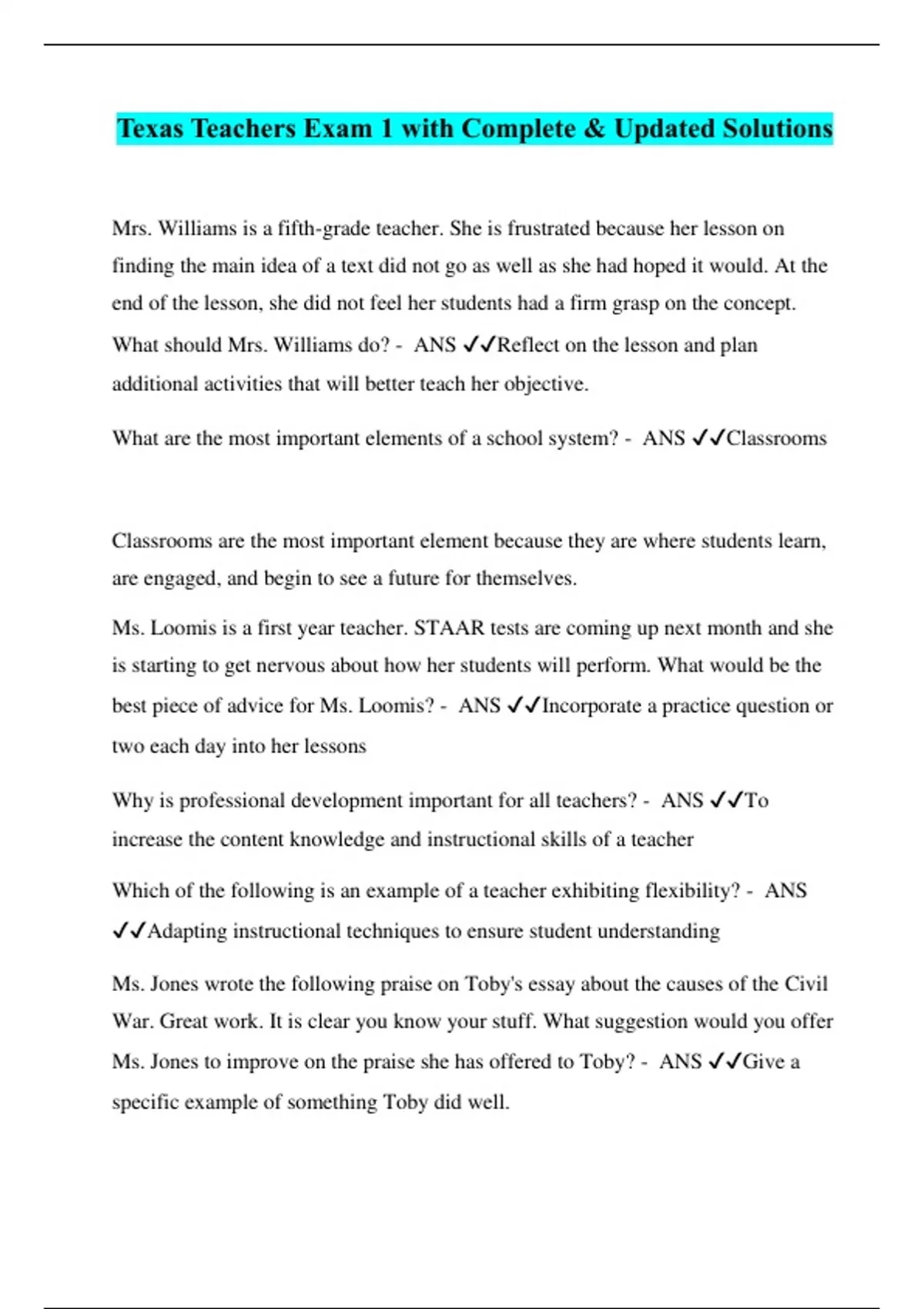 Texas Teachers Exam 1 with Complete & Updated Solutions Mrs. Williams is a fifth-grade teacher. She is frustrated because her lesson on finding the main idea of a text did not go as well as she had hoped it would. At the end of the lesson, she did not feel her students had a firm grasp on the concept. What should Mrs. Williams do? - ANS ️️ Reflect on the lesson and plan additional activities that will better teach her objective. What are the most important elements of a school system? - ANS ️️ Classrooms Classrooms are the most important element because they are where students learn, are engaged, and begin to see a future for themselves. Ms. Loomis is a first year teacher. STAAR tests are coming up next month and she is starting to get nervous about how her students will perform. What would be the best piece of advice for Ms. Loomis? - ANS ️️ Incorporate a practice question or two each day into her lessons Why is professional development important for all teachers? - ANS ️️ To increase the content knowledge and instructional skills of a teacher Which of the following is an example of a teacher exhibiting flexibility? - ANS ️️ Adapting instructional techniques to ensure student understanding Ms. Jones wrote the following praise on Toby's essay about the causes of the Civil War. Great work. It is clear you know your stuff. What suggestion would you offer Ms. Jones to improve on the praise she has offered to Toby? - ANS ️️ Give a specific example of something Toby did well.