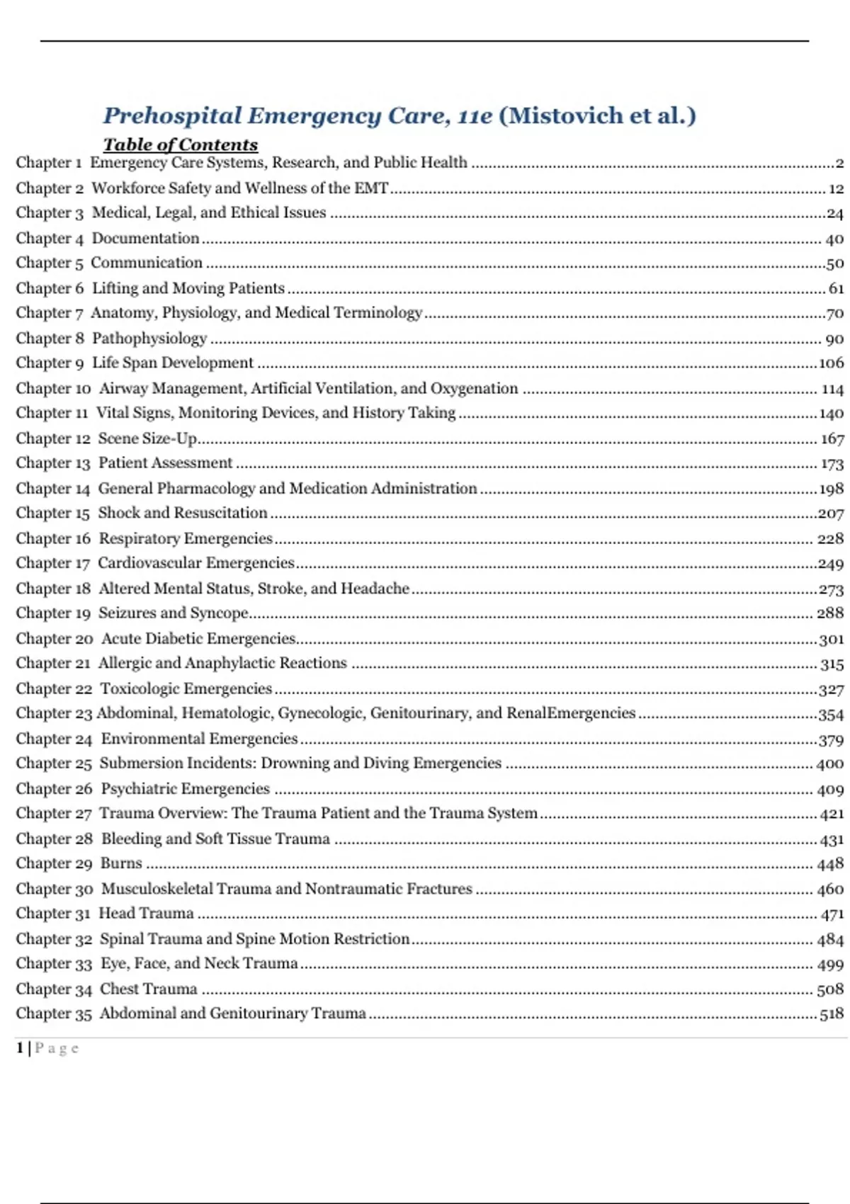 TEST BANK PREHOSPITAL EMERGENCY CARE JOSEPH J. MISTOVICH, KEITH J. KARREN, BRENT HAFENTable of Contents Chapter 1 Emergency Care Systems, Research, and Public Health ..................................................................................... 2 Chapter 2 Workforce Safety and Wellness of the EMT ...................................................................................................... 12 Chapter 3 Medical, Legal, and Ethical Issues .................................................................................................................... 24 Chapter 4 Documentation ................................................................................................................................................. 40 Chapter 5 Communication .................................................................................................................................................50 Chapter 6 Lifting and Moving Patients .............................................................................................................................. 61 Chapter 7 Anatomy, Physiology, and Medical Terminology .............................................................................................. 70 Chapter 8 Pathophysiology ............................................................................................................................................... 90 Chapter 9 Life Span Development ................................................................................................................................... 106 Chapter 10 Airway Management, Artificial Ventilation, and Oxygenation ..................................................................... 114 Chapter 11 Vital Signs, Monitoring Devices, and History Taking .................................................................................... 140 Chapter 12 Scene Size-Up ................................................................................................................................................. 167 Chapter 13 Patient Assessment ........................................................................................................................................ 173 Chapter 14 General Pharmacology and Medication Administration ............................................................................... 198 Chapter 15 Shock and Resuscitation ................................................................................................................................ 207 Chapter 16 Respiratory Emergencies .............................................................................................................................. 228 Chapter 17 Cardiovascular Emergencies ..........................................................................................................................249 Chapter 18 Altered Mental Status, Stroke, and Headache ............................................................................................... 273 Chapter 19 Seizures and Syncope .................................................................................................................................... 288 Chapter 20 Acute Diabetic Emergencies.......................................................................................................................... 301 Chapter 21 Allergic and Anaphylactic Reactions ............................................................................................................. 315 Chapter 22 Toxicologic Emergencies ............................................................................................................................... 327 Chapter 23 Abdominal, Hematologic, Gynecologic, Genitourinary, and Renal Emergencies .......................................... 354 Chapter 24 Environmental Emergencies ......................................................................................................................... 379 Chapter 25 Submersion Incidents: Drowning and Diving Emergencies ........................................................................ 400 Chapter 26 Psychiatric Emergencies .............................................................................................................................. 409 Chapter 27 Trauma Overview: The Trauma Patient and the Trauma System ................................................................. 421 Chapter 28 Bleeding and Soft Tissue Trauma ................................................................................................................. 431 Chapter 29 Burns ............................................................................................................................................................ 448 Chapter 30 Musculoskeletal Trauma and Nontraumatic Fractures ............................................................................... 460 Chapter 31 Head Trauma ................................................................................................................................................. 471 Chapter 32 Spinal Trauma and Spine Motion Restriction .............................................................................................. 484 Chapter 33 Eye, Face, and Neck Trauma ........................................................................................................................ 499 Chapter 34 Chest Trauma ............................................................................................................................................... 508 Chapter 35 Abdominal and Genitourinary Trauma ......................................................................................................... 518 1 | P a g eChapter 36 Multisystem Trauma and Trauma in Special Patient Populations ............................................................... 526 Chapter 37 Obstetrics and Care of the Newborn ...........................................................................