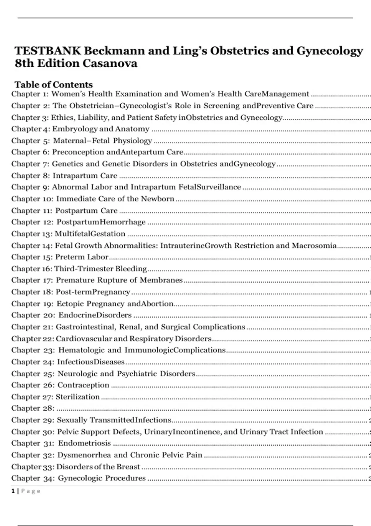 TESTBANK Beckmann and Ling’s Obstetrics and Gynecology 8th Edition CasanovaTable of Contents Chapter 1: Women’s Health Examination and Women’s Health Care Management ................................ 2 Chapter 2: The Obstetrician–Gynecologist’s Role in Screening and Preventive Care ............................ 10 Chapter 3: Ethics, Liability, and Patient Safety in Obstetrics and Gynecology............................................. 15 Chapter 4: Embryology and Anatomy ............................................................................................................. 20 Chapter 5: Maternal–Fetal Physiology ............................................................................................................ 27 Chapter 6: Preconception and Antepartum Care ............................................................................................. 35 Chapter 7: Genetics and Genetic Disorders in Obstetrics and Gynecology ............................................... 45 Chapter 8: Intrapartum Care ............................................................................................................................. 53 Chapter 9: Abnormal Labor and Intrapartum Fetal Surveillance ................................................................ 62 Chapter 10: Immediate Care of the Newborn ................................................................................................. 72 Chapter 11: Postpartum Care ............................................................................................................................. 79 Chapter 12: Postpartum Hemorrhage ............................................................................................................... 88 Chapter 13: Multifetal Gestation ......................................................................................................................... 92 Chapter 14: Fetal Growth Abnormalities: Intrauterine Growth Restriction and Macrosomia ................. 99 Chapter 15: Preterm Labor .................................................................................................................................107 Chapter 16: Third-Trimester Bleeding .............................................................................................................. 116 Chapter 17: Premature Rupture of Membranes ............................................................................................ 121 Chapter 18: Post-term Pregnancy ..................................................................................................................... 128 Chapter 19: Ectopic Pregnancy and Abortion................................................................................................. 135 Chapter 20: Endocrine Disorders .................................................................................................................... 144 Chapter 21: Gastrointestinal, Renal, and Surgical Complications ............................................................. 147 Chapter 22: Cardiovascular and Respiratory Disorders .............................................................................. 152 Chapter 23: Hematologic and Immunologic Complications ....................................................................... 161 Chapter 24: Infectious Diseases ......................................................................................................................... 167 Chapter 25: Neurologic and Psychiatric Disorders ...................................................................................... 177 Chapter 26: Contraception ................................................................................................................................ 179 Chapter 27: Sterilization .....................................................................................................................................185 Chapter 28: ...........................................................................................................................................................193 Chapter 29: Sexually Transmitted Infections ................................................................................................. 201 Chapter 30: Pelvic Support Defects, Urinary Incontinence, and Urinary Tract Infection ...................... 213 Chapter 31: Endometriosis ...............................................................................................................................221 Chapter 32: Dysmenorrhea and Chronic Pelvic Pain ................................................................................. 227 Chapter 33: Disorders of the Breast ................................................................................................................ 237 Chapter 34: Gynecologic Procedures ............................................................................................................. 244 1 | P a g eChapter 35: Human Sexuality .......................................................................................................................... 250 Chapter 36: Sexual Assault and Domestic Violence .................................................................................... 255 Chapter 37: Reproductive Cycles .................................................................................................................... 259 Chapter 38: Puberty ........................................................................................................................................... 265 Chapter 39: Amenorrhea and Abnormal Uterine Bleeding ...................................................................... 274 Chapter 40: Hirsutism and Virilization .......................................................................................................... 280 Chapter 41: Menopause ............................................................................................................................