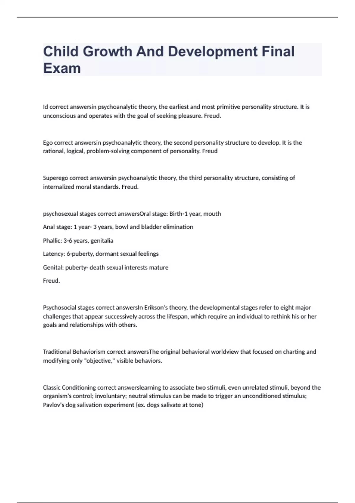 Id correct answersin psychoanalytic theory, the earliest and most primitive personality structure. It is unconscious and operates with the goal of seeking pleasure. Freud. Ego correct answersin psychoanalytic theory, the second personality structure to develop. It is the rational, logical, problem-solving component of personality. Freud Superego correct answersin psychoanalytic theory, the third personality structure, consisting of internalized moral standards. Freud. psychosexual stages correct answersOral stage: Birth-1 year, mouth Anal stage: 1 year- 3 years, bowl and bladder elimination Phallic: 3-6 years, genitalia Latency: 6-puberty, dormant sexual feelings Genital: puberty- death sexual interests mature Freud. Psychosocial stages correct answersIn Erikson's theory, the developmental stages refer to eight major challenges that appear successively across the lifespan, which require an individual to rethink his or her goals and relationships with others. Traditional Behaviorism correct answersThe original behavioral worldview that focused on charting and modifying only "objective," visible behaviors. Classic Conditioning correct answerslearning to associate two stimuli, even unrelated stimuli, beyond the organism's control; involuntary; neutral stimulus can be made to trigger an unconditioned stimulus; Pavlov's dog salivation experiment (ex. dogs salivate at tone)