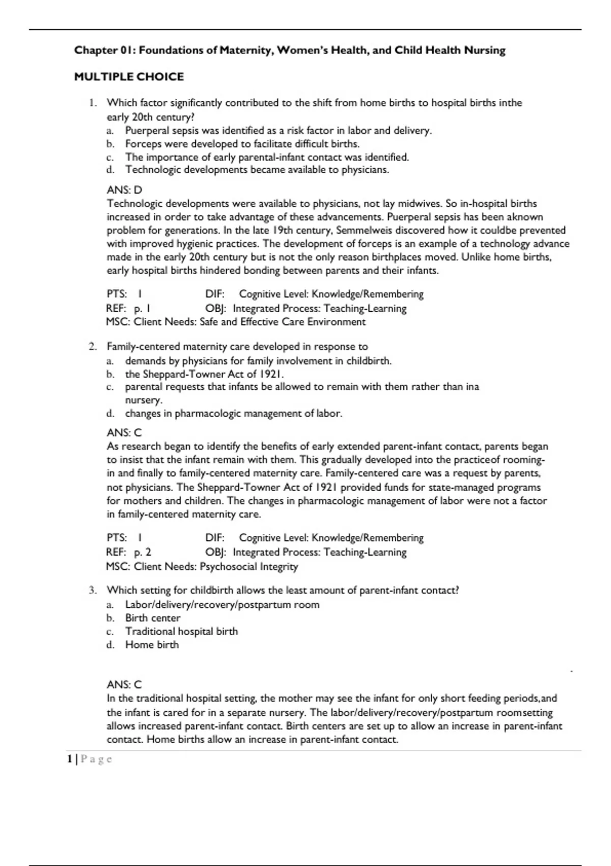 TEST BANK MCKINNEY; EVOLVE RESOURCES FOR MATERNAL-CHILD NURSING, 5TH EDITION TEST BANKMULTIPLE CHOICE 1. Which factor significantly contributed to the shift from home births to hospital births in the early 20th century? a. Puerperal sepsis was identified as a risk factor in labor and delivery. b. Forceps were developed to facilitate difficult births. c. The importance of early parental-infant contact was identified. d. Technologic developments became available to physicians. ANS: D Technologic developments were available to physicians, not lay midwives. So in-hospital births increased in order to take advantage of these advancements. Puerperal sepsis has been a known problem for generations. In the late 19th century, Semmelweis discovered how it could be prevented with improved hygienic practices. The development of forceps is an example of a technology advance made in the early 20th century but is not the only reason birthplaces moved. Unlike home births, early hospital births hindered bonding between parents and their infants. PTS: 1 REF: p. 1 DIF: Cognitive Level: Knowledge/Remembering OBJ: Integrated Process: Teaching-Learning MSC: Client Needs: Safe and Effective Care Environment 2. Family-centered maternity care developed in response to a. demands by physicians for family involvement in childbirth. b. the Sheppard-Towner Act of 1921. c. parental requests that infants be allowed to remain with them rather than in a nursery. d. changes in pharmacologic management of labor. ANS: C As research began to identify the benefits of early extended parent-infant contact, parents began to insist that the infant remain with them. This gradually developed into the practice of roomingin and finally to family-centered maternity care. Family-centered care was a request by parents, not physicians. The Sheppard-Towner Act of 1921 provided funds for state-managed programs for mothers and children. The changes in pharmacologic management of labor were not a factor in family-centered maternity care. PTS: 1 REF: p. 2 DIF: Cognitive Level: Knowledge/Remembering OBJ: Integrated Process: Teaching-Learning MSC: Client Needs: Psychosocial Integrity 3. Which setting for childbirth allows the least amount of parent-infant contact? a. Labor/delivery/recovery/postpartum room b. Birth center c. Traditional hospital birth d. Home birth . ANS: C In the traditional hospital setting, the mother may see the infant for only short feeding periods, and the infant is cared for in a separate nursery. The labor/delivery/recovery/postpartum room setting allows increased parent-infant contact. Birth centers are set up to allow an increase in parent-infant contact. Home births allow an increase in parent-infant contact. 1 | P a g ePTS: 1 REF: p. 2 DIF: Cognitive Level: Knowledge/Remembering OBJ: Nursing Process: Planning MSC: Client Needs: Health Promotion and Maintenance 4. As a result of changes in health care delivery and funding, a current trend seen in the pediatric setting is a. increased hospitalization of children. b. decreased number of children living in poverty. c. an increase in ambulatory care. d. decreased use of managed care. ANS: C One effect of managed care has been that pediatric health care delivery has shifted dramatically from the acute care setting to the ambulatory setting in order to provide more cost-efficient care. The number of hospital beds being used has decreased as more care is given in outpatient settings and in the home. The number of children living in poverty has increased over the past decade. One of the biggest changes in health care has been the growth of managed care. PTS: 1 REF: p. 5 DIF: Cognitive Level: Knowledge/Remembering OBJ: Nursing Process: Planning MSC: Client Needs: Safe and Effective Care Environment 5. The Women, Infants, and Children (WIC) program provides a. well-child examinations for infants and children living at the poverty level. b. immunizations for high-risk infants and children. c. screening for infants with developmental disorders. d. supplemental food supplies to low-income pregnant or breastfeeding women. ANS: D WIC is a federal program that provides supplemental food supplies to low-income women who are pregnant or breastfeeding and to their children until age 5 years. Medicaid’s Early and Periodic Screening, Diagnosis, and Treatment Program provides for well-child examinations and for treatment of any medical problems diagnosed during such checkups. Children in the WIC program are often referred for immunizations, but that is not the primary focus of the program. Public Law 99-457 is part of the Individuals with Disabilities Education Act that provides financial incentives to states to establish comprehensive early intervention services for infants and toddlers with, or at risk for, developmental disabilities. PTS: 1 DIF: Cognitive Level: Comprehension OBJ: Integrated Process: Teaching- Learning MSC: Client Needs: Health Promotion and Maintenance REF: p. 8 6. In most states, adolescents who are not emancipated minors must have the permission of their parents before . a. treatment for drug abuse. b. treatment for sexually transmitted diseases (STDs). c. accessing birth control. d. surgery. ANS: D Minors are not considered capable of giving informed consent, so a surgical procedure would 2 | P a g erequire consent of the parent or guardian. Exceptions exist for obtaining treatment for drug abuse or STDs or for getting birth control in most states. PTS: 1 REF: p. 17 DIF: Cognitive Level: Knowledge/Remembering OBJ: Nursing Process: Planning MSC: Client Needs: Safe and Effective Care Environment 7. The maternity nurse should have a clear understanding of the correct use of a clinical pathway. One characteristic of clinical pathways is that they a. are developed and implemented by nurses. b. are used primarily in the pediatric setting. c. set specific time lines for sequencing interventions. d. are part of the nursing process. ANS: C Clinical pathways are standardiz