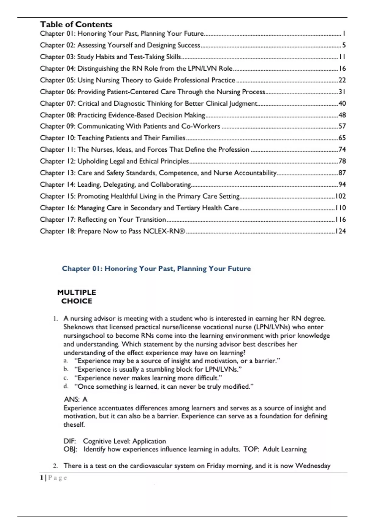 TEST BANKS FOR LPN TO RN TRANSITION BY LORA CLAYWELL 4TH EDITIONTable of Contents Chapter 01: Honoring Your Past, Planning Your Future ..................................................................................... 1 Chapter 02: Assessing Yourself and Designing Success ....................................................................................... 5 Chapter 03: Study Habits and Test-Taking Skills ................................................................................................. 11 Chapter 04: Distinguishing the RN Role from the LPN/LVN Role ................................................................. 16 Chapter 05: Using Nursing Theory to Guide Professional Practice ............................................................... 22 Chapter 06: Providing Patient-Centered Care Through the Nursing Process ............................................. 31 Chapter 07: Critical and Diagnostic Thinking for Better Clinical Judgment.................................................. 40 Chapter 08: Practicing Evidence-Based Decision Making .................................................................................. 48 Chapter 09: Communicating With Patients and Co-Workers ........................................................................ 57 Chapter 10: Teaching Patients and Their Families .............................................................................................. 65 Chapter 11: The Nurses, Ideas, and Forces That Define the Profession ...................................................... 74 Chapter 12: Upholding Legal and Ethical Principles ............................................................................................ 78 Chapter 13: Care and Safety Standards, Competence, and Nurse Accountability...................................... 87 Chapter 14: Leading, Delegating, and Collaborating ........................................................................................... 94 Chapter 15: Promoting Healthful Living in the Primary Care Setting........................................................... 102 Chapter 16: Managing Care in Secondary and Tertiary Health Care ........................................................... 110 Chapter 17: Reflecting on Your Transition ........................................................................................................ 116 Chapter 18: Prepare Now to Pass NCLEX-RN® ............................................................................................ 124 Chapter 01: Honoring Your Past, Planning Your Future MULTIPLE CHOICE 1. A nursing advisor is meeting with a student who is interested in earning her RN degree. She knows that licensed practical nurse/license vocational nurse (LPN/LVNs) who enter nursing school to become RNs come into the learning environment with prior knowledge and understanding. Which statement by the nursing advisor best describes her understanding of the effect experience may have on learning? a. “Experience may be a source of insight and motivation, or a barrier.” b. “Experience is usually a stumbling block for LPN/LVNs.” c. “Experience never makes learning more difficult.” d. “Once something is learned, it can never be truly modified.” ANS: A Experience accentuates differences among learners and serves as a source of insight and motivation, but it can also be a barrier. Experience can serve as a foundation for defining the self. DIF: Cognitive Level: Application OBJ: Identify how experiences influence learning in adults. TOP: Adult Learning 2. There is a test on the cardiovascular system on Friday morning, and it is now Wednesday 1 | P a g e Nnight. The student has already taken a vacation day from work Thursday night so that she can stay home and study. She is considering skipping her exercise class on Thursday morning to go to the library to prepare for the test. Which response best identifies the student’s outcome priority? a. Exercise class b. Going to the library c. Avoiding work by taking a vacation d. Doing well on the test on Friday ANS: D The outcome priority is the essential issue or need to be addressed at any given time within a set of conditions or circumstances. DIF: Cognitive Level: Application OBJ: Identify motivations and personal outcome priorities for returning to school. TOP: Motivation to Learn 3. A nurse who has been an LPN/LVN for 10 years is meeting with an advisor to discuss the possibility of taking classes to become an RN. The advisor interprets which statement by the nurse as the driving force for returning to school? a. “I’ll need to schedule time to attend classes.” b. “I’ll have to budget for paying tuition.” c. “I’ll have to rearranging my schedule.” d. “There is a possibility of advancement into administration.” ANS: D Driving forces are those that push toward making the change, as opposed to restraining forces, which are those that usually present a challenge that needs to be overcome for the change to take place or present a negative effect the change may initiate. DIF: Cognitive Level: Application OBJ: Identify motivations and personal outcome priorities for returning to school. TOP: Motivations for Change 4. An RN is caring for a diabetic patient. The patient appears interested in changing her lifestyle and has been asking questions about eating better. The nurse can interpret this behavior as which stage of Lewin’s Change Theory? a. Moving b. Unfreezing c. Action d. Refreezing ANS: B The patient is in the first phase of Lewin’s Change Theory, known as unfreezing. This phase involves determining that a change needs to occur and deciding to take action. Moving is the second phase and involves actively planning changes and taking action on them. Refreezing is the last stage, and it occurs when the change has become a part of the person’s life. DIF: Cognitive Level: Analysis OBJ: Understand Change Theory and how it applies to becoming an RN. TOP: Change Theo