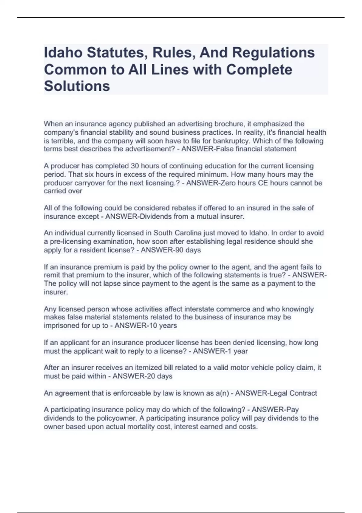 When an insurance agency published an advertising brochure, it emphasized the company's financial stability and sound business practices. In reality, it's financial health is terrible, and the company will soon have to file for bankruptcy. Which of the following terms best describes the advertisement? - ANSWER-False financial statement A producer has completed 30 hours of continuing education for the current licensing period. That six hours in excess of the required minimum. How many hours may the producer carryover for the next licensing.? - ANSWER-Zero hours CE hours cannot be carried over All of the following could be considered rebates if offered to an insured in the sale of insurance except - ANSWER-Dividends from a mutual insurer. An individual currently licensed in South Carolina just moved to Idaho. In order to avoid a pre-licensing examination, how soon after establishing legal residence should she apply for a resident license? - ANSWER-90 days If an insurance premium is paid by the policy owner to the agent, and the agent fails to remit that premium to the insurer, which of the following statements is true? - ANSWER-The policy will not lapse since payment to the agent is the same as a payment to the insurer. Any licensed person whose activities affect interstate commerce and who knowingly makes false material statements related to the business of insurance may be imprisoned for up to - ANSWER-10 years If an applicant for an insurance producer license has been denied licensing, how long must the applicant wait to reply to a license? - ANSWER-1 year After an insurer receives an itemized bill related to a valid motor vehicle policy claim, it must be paid within - ANSWER-20 days An agreement that is enforceable by law is known as a(n) - ANSWER-Legal Contract A participating insurance policy may do which of the following? - ANSWER-Pay dividends to the policyowner. A participating insurance policy will pay dividends to the owner based upon actual mortality cost, interest earned and costs. In any case where there is a controversy or dispute between the insurance company and the insured, the soliciting agent is the agent of the - ANSWER-company If a producer receives a large sum of money (over $2000) in the form of cash that is not payable to the insurer or the policy owner, within what time. Must a producer deposit the money into a fiduciary fund account? - ANSWER-3 Business days Who might receive dividends from a mutual insurer? - ANSWER-Policyholders Which of the following terms describes making false statements about the financial condition of any ensure that are intended to injure any person engaged in the business of insurance? - ANSWER-Defamation What is the maximum penalty for habitual willfull noncompliance with the fair credit reporting act? - ANSWER-$2,500 Which of the following is an agreement between an insured and an insurer, where the insurer agrees to indemnify the insured for specific losses in exchange for a premium? - ANSWER-insurance contract When the director conducts an examination of alien insurers, what is the typical extent of the examination? - ANSWER-Transactions occurring in the US only Which of the following authorities has the power to approve or disapprove an application for a certificate of authority? - ANSWER-Director of Insurance For a producer to share his commission with another producer, which of the following mu