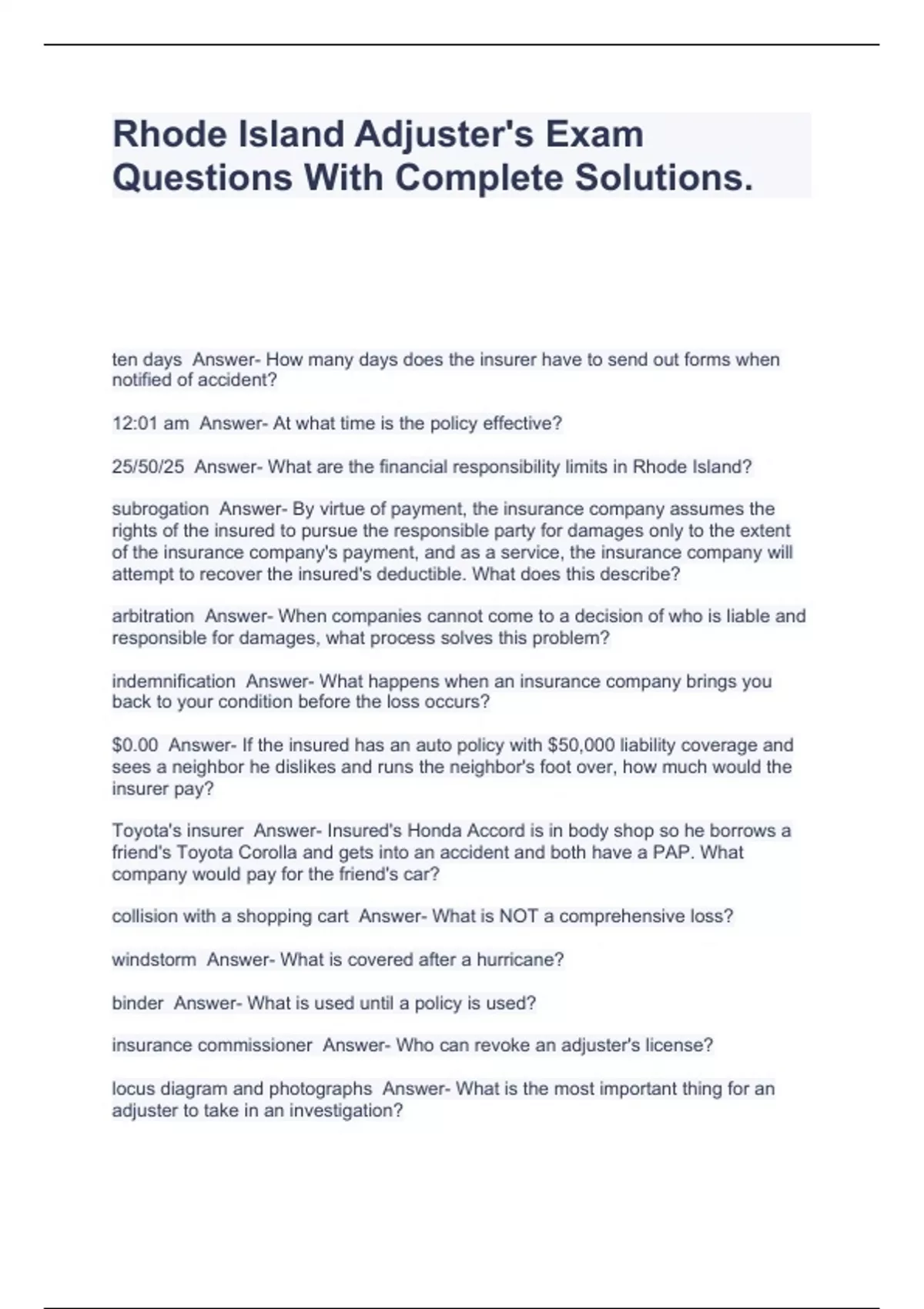 Rhode Island Adjuster's Exam Questions With Complete Solutions.