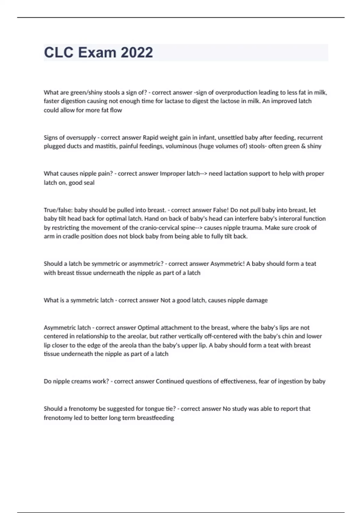 Signs of oversupply - correct answer Rapid weight gain in infant, unsettled baby after feeding, recurrent plugged ducts and mastitis, painful feedings, voluminous (huge volumes of) stools- often green & shiny