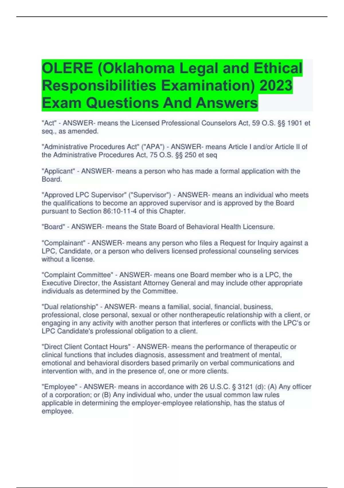 OLERE (Oklahoma Legal and Ethical Responsibilities Examination) 2023 Exam Questions And Answers "Act" - ANSWER- means the Licensed Professional Counselors Act, 59 O.S. §§ 1901 et seq., as amended. "Administrative Procedures Act" ("APA") - ANSWER- means Article I and/or Article II of the Administrative Procedures Act, 75 O.S. §§ 250 et seq "Applicant" - ANSWER- means a person who has made a formal application with the Board. "Approved LPC Supervisor" ("Supervisor") - ANSWER- means an individual who meets the qualifications to become an approved supervisor and is approved by the Board pursuant to Section 86:10-11-4 of this Chapter. "Board" - ANSWER- means the State Board of Behavioral Health Licensure. "Complainant" - ANSWER- means any person who files a Request for Inquiry against a LPC, Candidate, or a person who delivers licensed professional counseling services without a license. "Complaint Committee" - ANSWER- means one Board member who is a LPC, the Executive Director, the Assistant Attorney General and may include other appropriate individuals as determined by the Committee. "Dual relationship" - ANSWER- means a familial, social, financial, business, professional, close personal, sexual or other nontherapeutic relationship with a client, or engaging in any activity with another person that interferes or conflicts with the LPC's or LPC Candidate's professional obligation to a client. "Direct Client Contact Hours" - ANSWER- means the performance of therapeutic or clinical functions that includes diagnosis, assessment and treatment of mental, emotional and behavioral disorders based primarily on verbal communications and intervention with, and in the presence of, one or more clients. "Employee" - ANSWER- means in accordance with 26 U.S.C. § 3121 (d): (A) Any officer of a corporation; or (B) Any individual who, under the usual common law rules applicable in determining the employer-employee relationship, has the status of employee. "Face-to-face supervision" - ANSWER- means the Supervisor and the Candidate shall be in the physical presence of the other during individual or group supervision. "Forensic services" - ANSWER- means the application of knowledge, training and experience from the mental health field to the establishment of facts and/or the establishment of evidence in a court of law or ordered by a court of law. "Formal Complaint" - ANSWER- means a written statement of alleged violation(s) of the Act and/or Rules which is filed by the Assistant Attorney General. The Formal Complaint schedules an Individual Proceeding before the Board in accordance with 75 O.S. §309. "Counseling" - ANSWER- means the application of mental health and developmental principles in order to: a. facilitate human development and adjustment throughout the life span, b. prevent, diagnose or treat mental, emotional or behavioral disorders or associated distress which interfere with mental health, c. conduct assessments or diagnoses for the purpose of establishing treatment goals and objectives, and d. plan, implement or evaluate treatment plans using counseling treatment interventions; "Full time" - ANSWER- means at least twenty (20) hours of on-the-job experience per week. "Group supervision" - ANSWER- means an assemblage of two (2) to six (6) Candidates. "Home-study" or "technology-assisted distance learning" - ANSWER- means the delivery of graduate coursework or continuing education through mailed correspondence or other distance learning technologies, which focuses on using synchronous or asynchronous instructional delivery methods. "Licensed Professional Counselor" ("LPC") - ANSWER- means a person holding a current license issued pursuant to the provision of the Professional Counselor Licensure Act. "Licensed Professional Counselor Candidate" ("Candidate") - ANSWER- means a person whose application for licensure has been accepted and who is under supervision for licensure as provided in 59 O.S. §1906. "Licensure Committee" - ANSWER- means two LPC Board members, the Executive Director, and may include other appropriate individuals as determined by the Committee. "OAC" - ANSWER- means the Oklahoma Administrative Code. "On-site supervisor" - ANSWER- means a person who may not be an approved LPC supervisor but is licensed by the state of Oklahoma as a Licensed Marital and Family Therapist, Licensed Professional Counselor, Licensed Behavioral Practitioner, Psychologist, Clinical Social Worker, Psychiatrist, or Licensed Alcohol and Drug Counselor employed by the agency employing the LPC Candidate whose assigned job duties include acting as the immediate supervisor to the LPC Candidate and who is available to the candidate at all times when counseling services are being rendered by the LPC Candidate. "Request for Inquiry" ("RFI") - ANSWER- means a written or oral statement of complaint from any person alleging possible violation(s) of the Act and/or Rules. "Respondent" - ANSWER- means the person against whom an Individual Proceeding is initiated. "Staff" - ANSWER- means the personnel of the Board "Technology-assisted supervision" - ANSWER- refers to supervision that occurs through video teleconferencing, over secure internet connections, wherein a Supervisor and a Candidate are in separate physical locations. "Counseling treatment interventions" - ANSWER- means the application of cognitive, affective, behavioral and systemic counseling strategies which include principles of development, wellness, and pathology that reflect a pluralistic society. Such interventions are specifically i