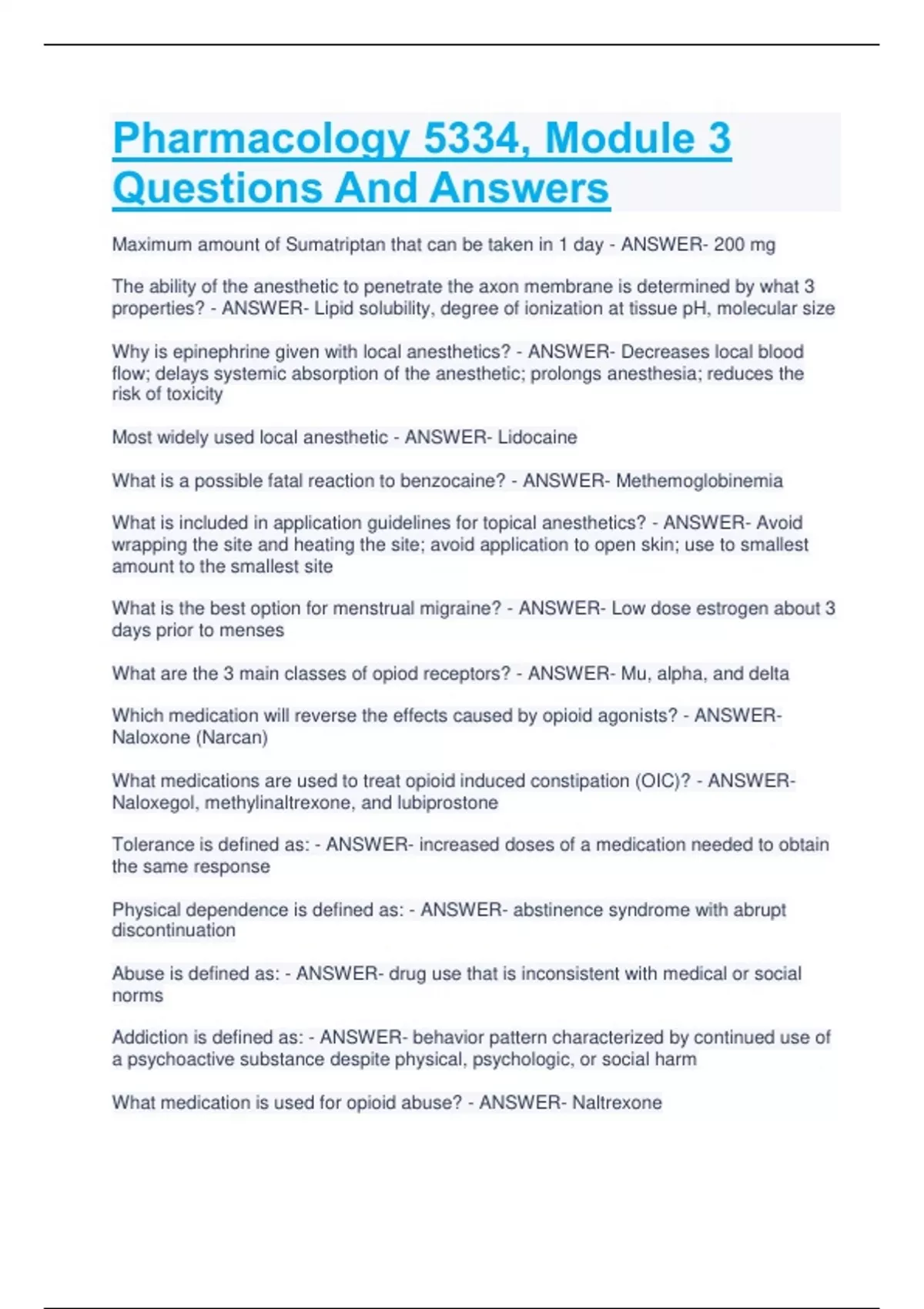 Pharmacology 5334, Module 3 Questions And Answers Maximum amount of Sumatriptan that can be taken in 1 day - ANSWER- 200 mg The ability of the anesthetic to penetrate the axon membrane is determined by what 3 properties? - ANSWER- Lipid solubility, degree of ionization at tissue pH, molecular size Why is epinephrine given with local anesthetics? - ANSWER- Decreases local blood flow; delays systemic absorption of the anesthetic; prolongs anesthesia; reduces the risk of toxicity Most widely used local anesthetic - ANSWER- Lidocaine What is a possible fatal reaction to benzocaine? - ANSWER- Methemoglobinemia What is included in application guidelines for topical anesthetics? - ANSWER- Avoid wrapping the site and heating the site; avoid application to open skin; use to smallest amount to the smallest site What is the best option for menstrual migraine? - ANSWER- Low dose estrogen about 3 days prior to menses What are the 3 main classes of opiod receptors? - ANSWER- Mu, alpha, and delta Which medication will reverse the effects caused by opioid agonists? - ANSWERNaloxone (Narcan) What medications are used to treat opioid induced constipation (OIC)? - ANSWERNaloxegol, methylinaltrexone, and lubiprostone Tolerance is defined as: - ANSWER- increased doses of a medication needed to obtain the same response Physical dependence is defined as: - ANSWER- abstinence syndrome with abrupt discontinuation Abuse is defined as: - ANSWER- drug use that is inconsistent with medical or social norms Addiction is defined as: - ANSWER- behavior pattern characterized by continued use of a psychoactive substance despite physical, psychologic, or social harm What medication is used for opioid abuse? - ANSWER- Naltrexone Euphoria induced by morphine: - ANSWER- an exaggerated sense of well-being caused by the activation of mu receptors What medication is given nasally for migraines? - ANSWER- Butorphanol Describe the mechanism of NSAIDs - ANSWER- Inhibition of the cyclo-oxygenase enzyme Second generation Cox 2 inhibitors: - ANSWER- suppress inflammation and cause less risk for GI ulceration than Cox 1; increase the risk for heart disease What medication should NOT be given with aspirin? - ANSWER- Glucocorticoids What medication is given for acetaminophen overdose? - ANSWER- Acetylcysteine What are non-endocrine therapeutic uses for glucocorticoids? - ANSWER- RA, SLE, IBS, bursitis, OA, gout, disorders of the eye What is the danger of prolonged use of glucocorticoids? - ANSWER- Adrenal insufficiency Methotrexate can cause fatal toxicities of: - ANSWER- bone marrow, liver, kidneys, lungs; hemorrhagic enteritis and GI perforation What must be checked yearly while taking etanercept? - ANSWER- TB What is the mechanism of action of etanercept? - ANSWER- Suppresses the immune system First line treatment of gout - ANSWER- Indomethacin When would you initiate a uricosuric medication? - ANSWER- more than 3 gout attacks per year Moderate-strong opioid agonists - ANSWER- codeine, oxycodone, hydrocodone, tapentadol Opioid agonist-antagonist - ANSWER- Pentazocine, nalbuphine, butorphanol, buprenorpine (prolongs QT) Non-opioid centrally acting analgesics - ANSWER- Tramadol (suicide and seizure risk), clonidine, Ziconotide, dexmetomidine (used for patients on mechanical ventilation)