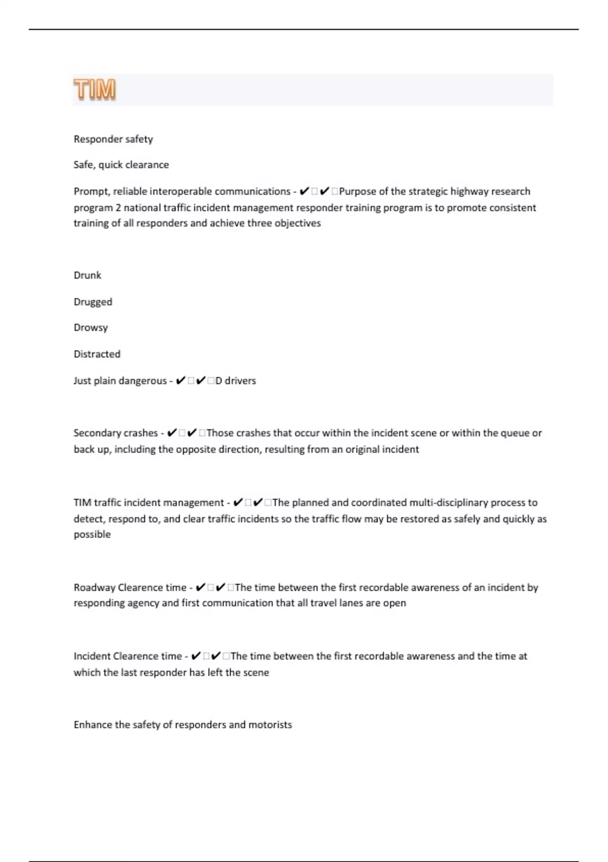 Responder safety Safe, quick clearance Prompt, reliable interoperable communications - ️️Purpose of the strategic highway research program 2 national traffic incident management responder training program is to promote consistent training of all responders and achieve three objectives Drunk Drugged Drowsy Distracted Just plain dangerous - ️️D drivers Secondary crashes - ️️Those crashes that occur within the incident scene or within the queue or back up, including the opposite direction, resulting from an original incident TIM traffic incident management - ️️The planned and coordinated multi-disciplinary process to detect, respond to, and clear traffic incidents so the traffic flow may be restored as safely and quickly as possible Roadway Clearence time - ️️The time between the first recordable awareness of an incident by responding agency and first communication that all travel lanes are open Incident Clearence time - ️️The time between the first recordable awareness and the time at which the last responder has left the scene Enhance the safety of responders and motorists