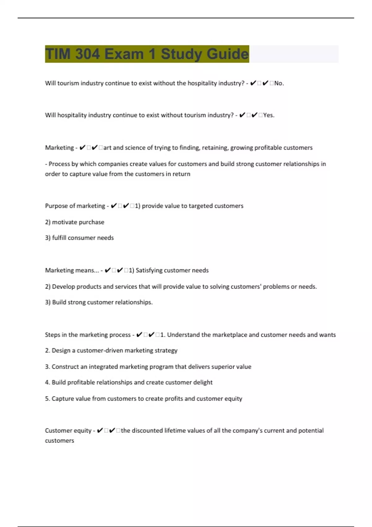 Will tourism industry continue to exist without the hospitality industry? - ️️No. Will hospitality industry continue to exist without tourism industry? - ️️Yes. Marketing - ️️art and science of trying to finding, retaining, growing profitable customers - Process by which companies create values for customers and build strong customer relationships in order to capture value from the customers in return Purpose of marketing - ️️1) provide value to targeted customers 2) motivate purchase 3) fulfill consumer needs Marketing means... - ️️1) Satisfying customer needs 2) Develop products and services that will provide value to solving customers' problems or needs. 3) Build strong customer relationships. Steps in the marketing process - ️️1. Understand the marketplace and customer needs and wants 2. Design a customer-driven marketing strategy 3. Construct an integrated marketing program that delivers superior value 4. Build profitable relationships and create customer delight 5. Capture value from customers to create profits and customer equity Customer equity - ️️the discounted lifetime values of all the company's current and potential customers
