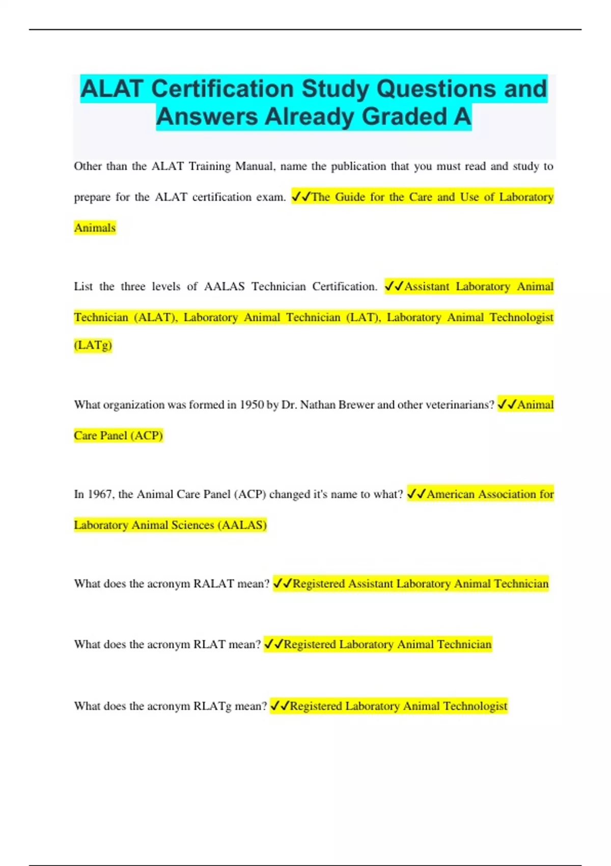 Other than the ALAT Training Manual, name the publication that you must read and study to prepare for the ALAT certification exam. The Guide for the Care and Use of Laboratory Animals List the three levels of AALAS Technician Certification. Assistant Laboratory Animal Technician (ALAT), Laboratory Animal Technician (LAT), Laboratory Animal Technologist (LATg)