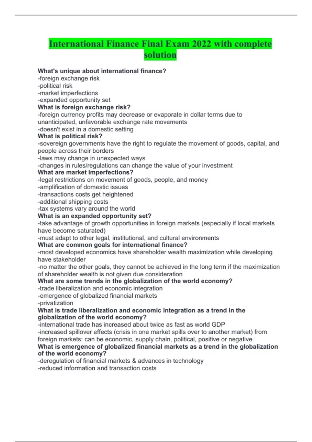 International Finance Final Exam 2022 with complete solution What's unique about international finance? -foreign exchange risk -political risk -market imperfections -expanded opportunity set What is foreign exchange risk? -foreign currency profits may decrease or evaporate in dollar terms due to unanticipated, unfavorable exchange rate movements -doesn't exist in a domestic setting What is political risk? -sovereign governments have the right to regulate the movement of goods, capital, and people across their borders -laws may change in unexpected ways -changes in rules/regulations can change the value of your investment What are market imperfections? -legal restrictions on movement of goods, people, and money -amplification of domestic issues -transactions costs get heightened -additional shipping costs -tax systems vary around the world What is an expanded opportunity set? -take advantage of growth opportunities in foreign markets (especially if local markets have become saturated) -must adapt to other legal, institutional, and cultural environments What are common goals for international finance? -most developed economics have shareholder wealth maximization while developing have stakeholder -no matter the other goals, they cannot be achieved in the long term if the maximization of shareholder wealth is not given due consideration What are some trends in the globalization of the world economy? -trade liberalization and economic integration -emergence of globalized financial markets -privatization What is trade liberalization and economic integration as a trend in the globalization of the world economy? -international trade has increased about twice as fast as world GDP -increased spillover effects (crisis in one market spills over to another market) from foreign markets: can be economic, supply chain, political, positive or negative What is emergence of globalized financial markets as a trend in the globalization of the world economy? -deregulation of financial markets & advances in technology -reduced information and transaction costs -innovations: currency futures & options, multi currency bonds, cross border stock listings, international mutual funds What is privatization as a trend in the globalization of the world economy? -selling of state run enterprises to investors known as denationalization -increases the efficiency of the enterprise -goal is to raise revenue What is a multinational corporation? -firm incorporated in one country with production and sales operations in other countries -obtain raw materials from one nation, financial capital from another, produce goods in a 3rd country, and sell output in various other national markets What is the key issue with governance and the public corporation? -conflict of interest between managers & shareholders -management friendly insiders dominate the board of directors with few outsiders who can monitor the management What is a public corporation? -an efficient risk sharing mechanism that allows corporations to raise large amounts of capital -redistribution of risk -shareholders benefits from their investment in the company What happened with Enron in regards to governance and the public corporation issue? -the board of directors failed to safeguard shareholder interests -significant agency problem -free rider problem What is the agency problem? -shareholders allocate decision making to managers -many shareholders are not qualified to make complex business decisions or have the time -managers often act in their short term best interest instead of the shareholder's long term best interest What are the remedies for the agency problem? -US: shareholders have the right to elect the board of directors -if the board remains independent of management, it can serve as an effective mechanism for curbing the agency problem (the board can serve as a referee looking at the process and decisions) -concentrated ownership What is the corporate board like in Germany? -not legally charged with representing the interests of shareholders -representing the interests of stakeholders as well as shareholders What is the corporate board like in Japan? -insider dominated -concerned with the welfare of the keiretsu to which the company belongs What is most important in corporate board interests? -shareholder interests -if you lose shareholders then you lose investment and company growth What are the issues with incentive contracts? -difficult to design compensation giving executives incentive to work hard at increasing shareholder wealth -accounting based schemes are subject to manipulation What is the outcome of stock options as an incentive contract? -managers are more likely to take riskier bets because they are more likely to get money -if they are longer term (increased maturity) then this offsets the short term manipulation to make them more valuable to management What are executive stock options? -exist to align the interests of shareholders and managers -call options on the employer's shares -inalienable: can't be sold -typical maturity: 10 years -typical vesting: 3 years Where is concentrated ownership common? everywhere in the world except the US and UK What can have a major disciplinary effect on managers? How? -borrowing (debt) -motivating them to curb private perquisites and wasteful investments -trim bloated organizations -if managers fail to pay interest and principal then the company can be forced into bankruptcy Why do companies list their stock overseas? -countries with weak investor protection can bond themselves credibly to better investor protection by listing in countries with strong investor protection -results in more transparency and greater value -essentially the company has to follow the standards and share information of the country with greater protection What happens if the management team is out of control over time? -share price will decline -eventually a corporate raider will buy enough shares to gain control of the board -f