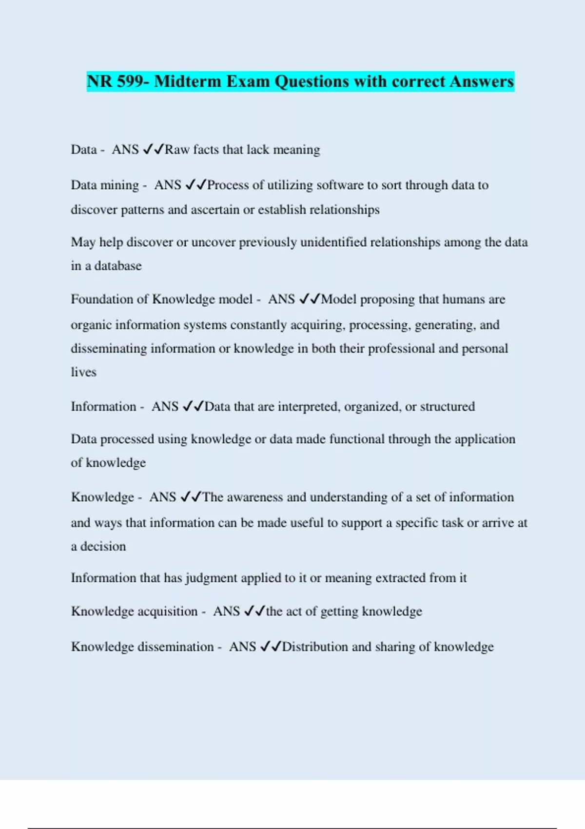 NR 599- Midterm Exam Questions with correct Answers Data - ANS ️️ Raw facts that lack meaning Data mining - ANS ️️ Process of utilizing software to sort through data to discover patterns and ascertain or establish relationships May help discover or uncover previously unidentified relationships among the data in a database Foundation of Knowledge model - ANS ️️ Model proposing that humans are organic information systems constantly acquiring, processing, generating, and disseminating information or knowledge in both their professional and personal lives Information - ANS ️️ Data that are interpreted, organized, or structured Data processed using knowledge or data made functional through the application of knowledge Knowledge - ANS ️️ The awareness and understanding of a set of information and ways that information can be made useful to support a specific task or arrive at a decision Information that has judgment applied to it or meaning extracted from it Knowledge acquisition - ANS ️️ the act of getting knowledge Knowledge dissemination - ANS ️️ Distribution and sharing of knowledge