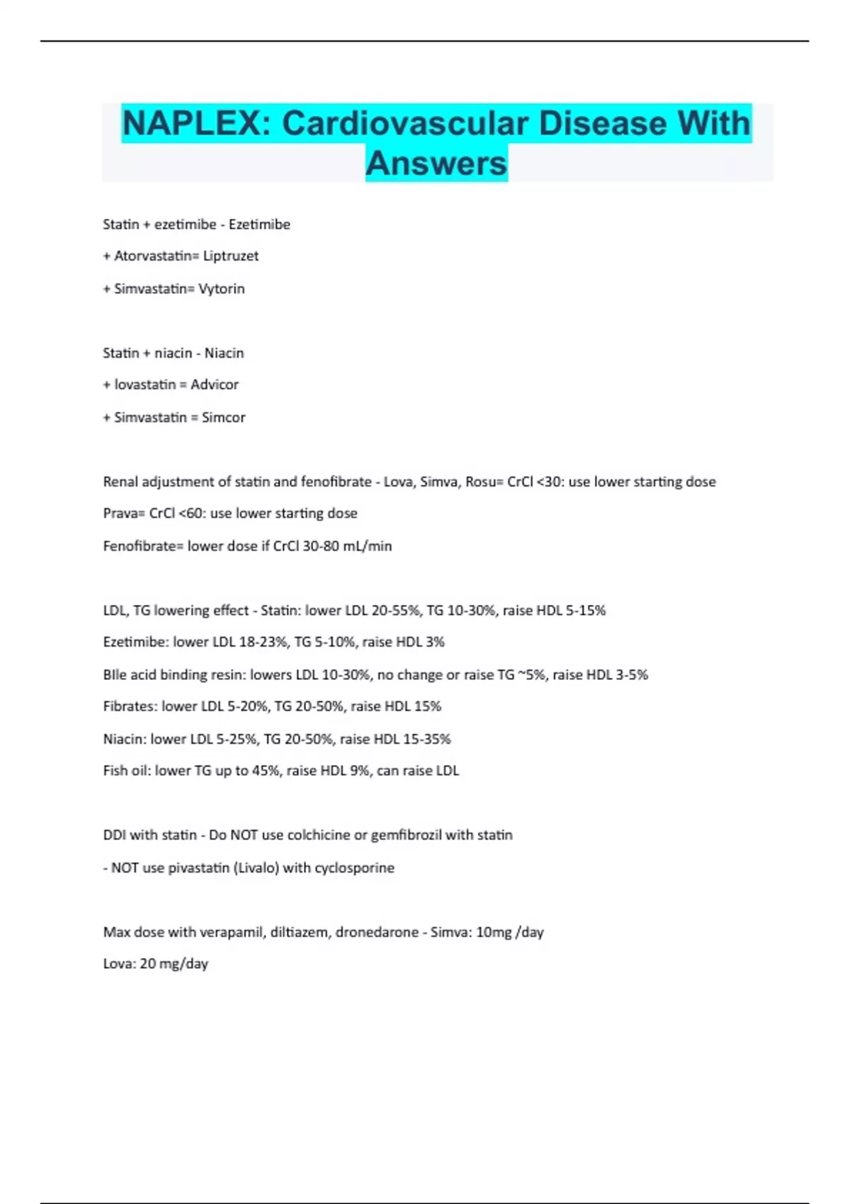 Statin + ezetimibe - Ezetimibe + Atorvastatin= Liptruzet + Simvastatin= Vytorin Statin + niacin - Niacin + lovastatin = Advicor + Simvastatin = Simcor Renal adjustment of statin and fenofibrate - Lova, Simva, Rosu= CrCl 30: use lower starting dose Prava= CrCl 60: use lower starting dose Fenofibrate= lower dose if CrCl 30-80 mL/min LDL, TG lowering effect - Statin: lower LDL 20-55%, TG 10-30%, raise HDL 5-15% Ezetimibe: lower LDL 18-23%, TG 5-10%, raise HDL 3% BIle acid binding resin: lowers LDL 10-30%, no change or raise TG ~5%, raise HDL 3-5% Fibrates: lower LDL 5-20%, TG 20-50%, raise HDL 15% Niacin: lower LDL 5-25%, TG 20-50%, raise HDL 15-35% Fish oil: lower TG up to 45%, raise HDL 9%, can raise LDL DDI with statin - Do NOT use colchicine or gemfibrozil with statin - NOT use pivastatin (Livalo) with cyclosporine Max dose with verapamil, diltiazem, dronedarone - Simva: 10mg /day Lova: 20 mg/day Max dose with amiadarone - Simva: 20 mg/day Lova: 40 mg/day ACC/AHA recommendation for bile acid sequestrant - *do NOT recommend when TG 300 mg/dL Cholestyramine (Questran), Colesevelam (Welchol), Colestipol (Colestid) hepatotoxicity - Niacin Lomitapide (Juxtapid) - REMS program Mipomersen (Kynamro) - REMS program Cholesterol lowering agent available as inejctable - Alirocumab (Praluent)- q2wk Evolocumab (Repatha)- q month or q2wk Mipomersen (Kynamro)-q1wk Lovaza - 1) can be tried as an alt to fenofibrate to lower TG 2) Should be used in addition to low-fat diet 3) can increase LDL level 4) If use OTC fish oil, will need to double the amount to get similar TG lowering effect as RX ones 5) Max dose is 2 cap BID 6) Indication: to lower TG in pts with TG500 as adjunct to diet Drugs that affect lipid profile - Cyclosporine, amiodarone, prednisone, beta-blocker