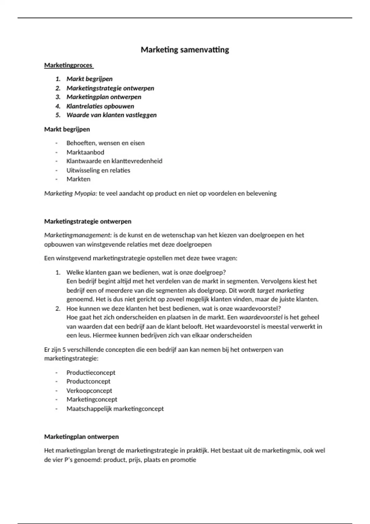 Samenvatting Marketing, in dit document staat alle belangrijke begrippen die je moet kennen voor het tentamen. Ook heb ik alle rijtjes uitgeschreven, deze moet je uit je hoofd stampen en als je deze weet haal je het tentamen, net als ik ! :)