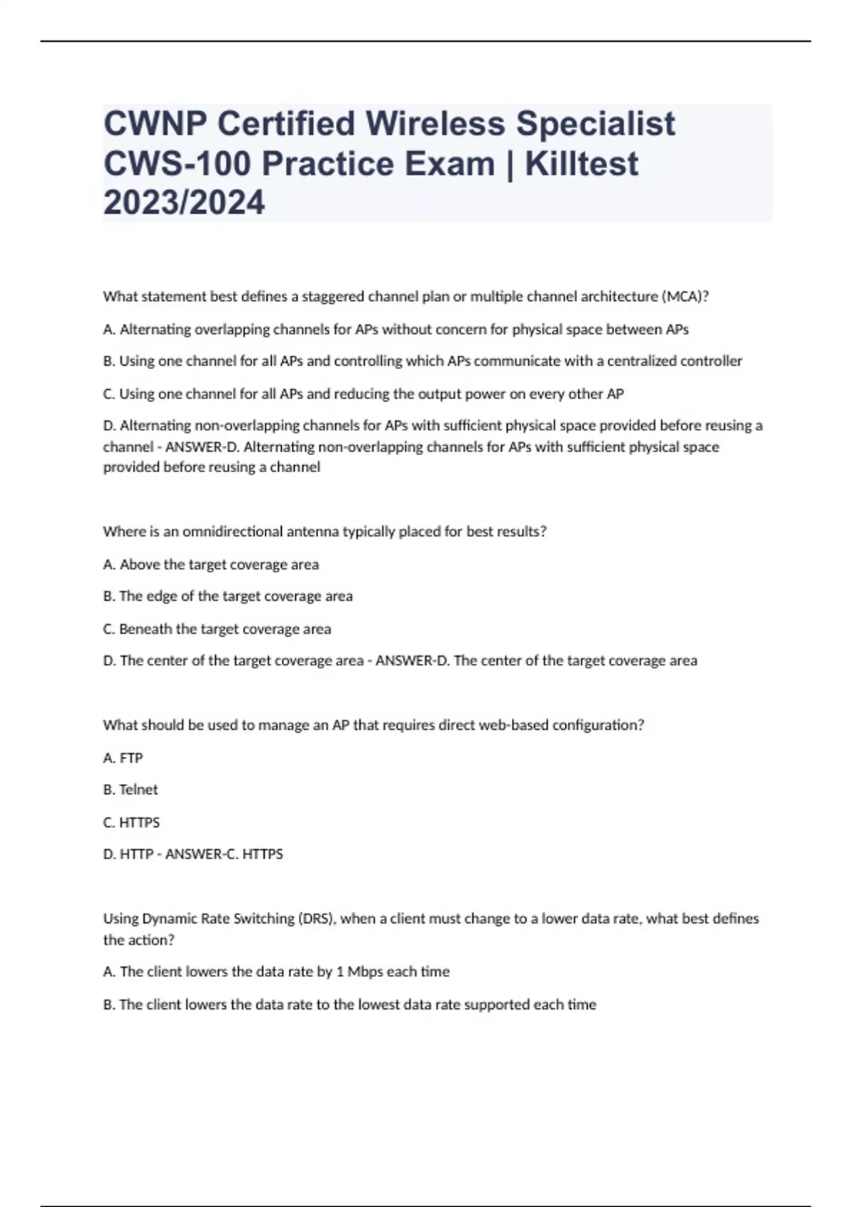 CWNP Certified Wireless Specialist CWS-100 Practice Exam | Killtest 2023/2024 What statement best defines a staggered channel plan or multiple channel architecture (MCA)? A. Alternating overlapping channels for APs without concern for physical space between APs B. Using one channel for all APs and controlling which APs communicate with a centralized controller C. Using one channel for all APs and reducing the output power on every other AP D. Alternating non-overlapping channels for APs with sufficient physical space provided before reusing a channel - ANSWER-D. Alternating non-overlapping channels for APs with sufficient physical space provided before reusing a channel Where is an omnidirectional antenna typically placed for best results? A. Above the target coverage area B. The edge of the target coverage area C. Beneath the target coverage area D. The center of the target coverage area - ANSWER-D. The center of the target coverage area What should be used to manage an AP that requires direct web-based configuration? A. FTP B. Telnet C. HTTPS D. HTTP - ANSWER-C. HTTPS Using Dynamic Rate Switching (DRS), when a client must change to a lower data rate, what best defines the action? A. The client lowers the data rate by 1 Mbps each time B. The client lowers the data rate to the lowest data rate supported each time