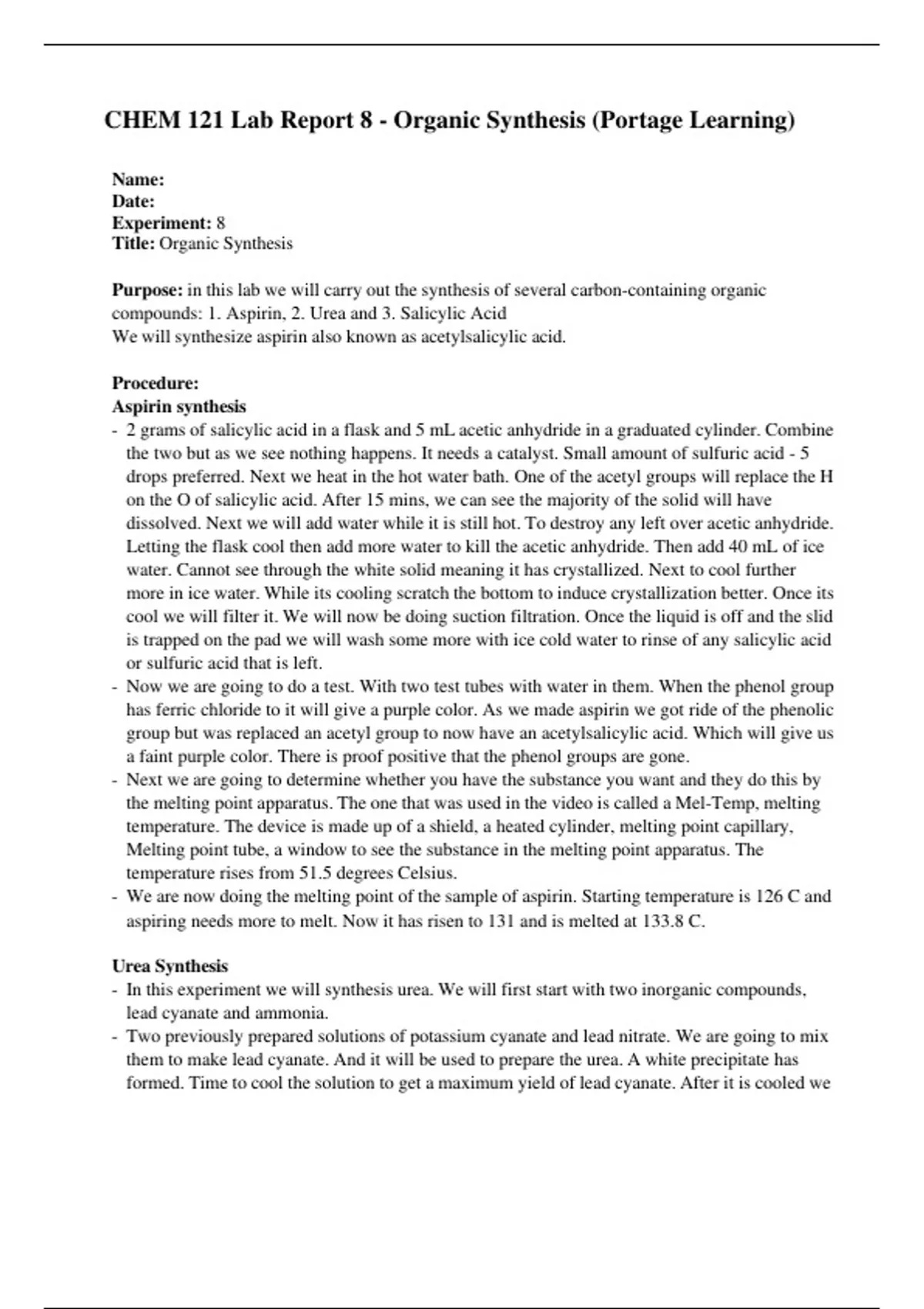 CHEM 121 Lab Report 8 - Organic Synthesis (Portage Learning)