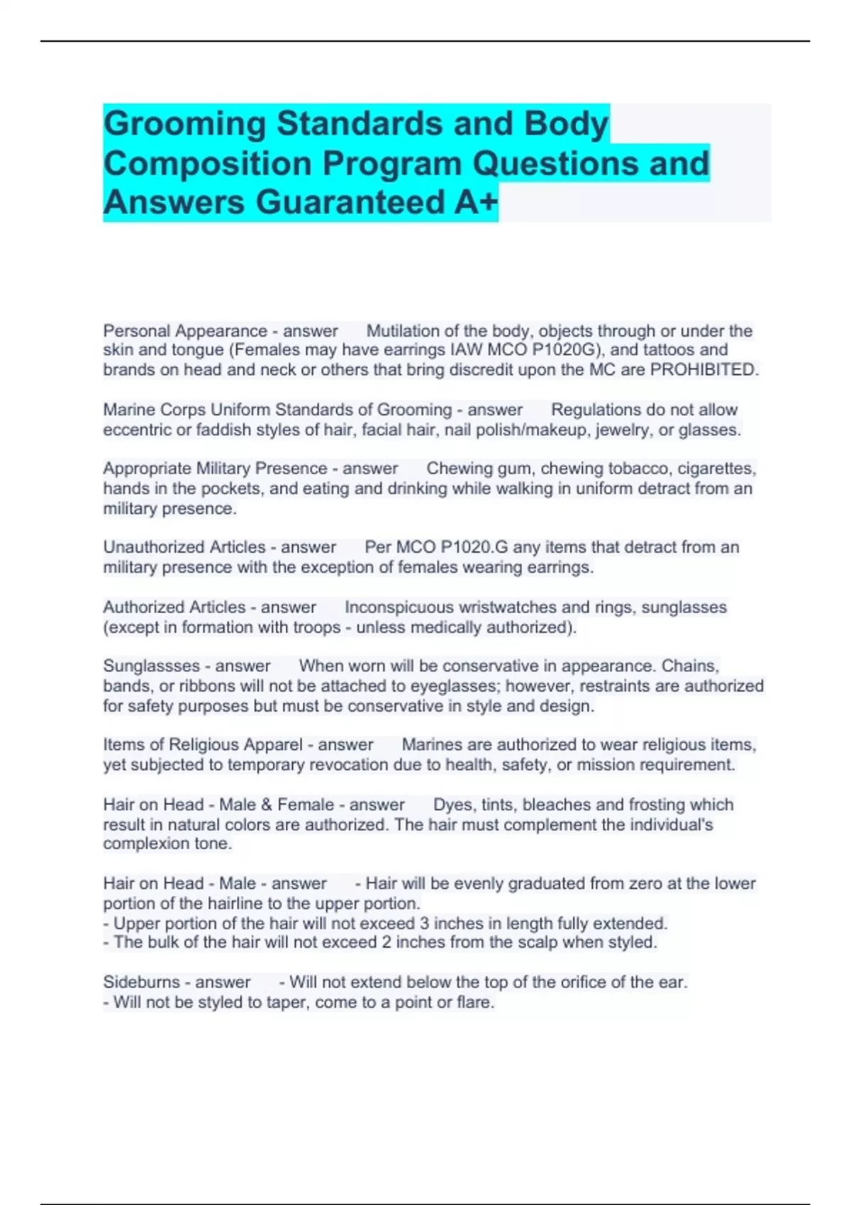 Grooming Standards and Body Composition Program Questions and Answers Guaranteed A+ Personal Appearance Mutilation of the body, objects through or under the skin and tongue (Females may have earrings IAW MCO P1020G), and tattoos and brands on head and neck or others that bring discredit upon the MC are PROHIBITED. Marine Corps Uniform Standards of Grooming Regulations do not allow eccentric or faddish styles of hair, facial hair, nail polish/makeup, jewelry, or glasses. Appropriate Military Presence Chewing gum, chewing tobacco, cigarettes, hands in the pockets, and eating and drinking while walking in uniform detract from an military presence. Unauthorized Articles Per MCO P1020.G any items that detract from an military presence with the exception of females wearing earrings. Authorized Articles Inconspicuous wristwatches and rings, sunglasses (except in formation with troops - unless medically authorized). Sunglassses When worn will be conservative in appearance. Chains, bands, or ribbons will not be attached to eyeglasses; however, restraints are authorized for safety purposes but must be conservative in style and design. Items of Religious Apparel Marines are authorized to wear religious items, yet subjected to temporary revocation due to health, safety, or mission requirement. Hair on Head - Male & Female Dyes, tints, bleaches and frosting which result in natural colors are authorized. The hair must complement the individual's complexion tone. Hair on Head - Male - Hair will be evenly graduated from zero at the lower portion of the hairline to the upper portion. - Upper portion of the hair will not exceed 3 inches in length fully extended. - The bulk of the hair will not exceed 2 inches from the scalp when styled. Sideburns - Will not extend below the top of the orifice of the ear. - Will not be styled to taper, come to a point or flare. - Will not exceed 1/8 inch when fully extended. Hair Styles - Male - Hair that protrudes from beneath properly worn headgear is considered excessive regardless of length. - Hair cannot have eccentric directional flow, twists or spiking. - Clipping of hair to scalp is authorized, not required unless undergoing recruit training or medically precribed Unauthorized Hair Styles 1. Single patches on top of head (not consistent with natural hair loss) 2. Mohawks 3. Large open bald areas on top of the head (not consistent with natural hair loss) 4. Etching of letter, signs or figures, and braiding. Hair Styles - Male - One natural, narrow, fore and aft off centered part is authorized. (Placed no further than the outer corner of the eye and will not extend down the back of the head) - Gel/moose products should provide a conservative/natural appearance. Mustaches Authorized but will be neatly trimmed and must be contained within the corners of the mouth and below the nose. Cannot extend more than a 1/2 inch in length. Chest Hair Only required to be clipped with it protruded above the collar of the under shirt. Hair on Head - Females Hair may touch the collar, but will not fall below the collar's lower edge. Female Hair during PT Hair will be allowed to fall naturally except when considered a safety hazard; however, this does not apply with PTing in full cammies. Ponytails are authorized as long as hair-securing devices are consistent with hair color. Boot and utes PT, hair can follow PT guidelines. Hairstyles - Female - Hairstyles which no don't allow headgear to be properly worn are prohibited. - Faddish and exaggerated styles such as shaved portions, designs in hair, and unsecured ponytails that are unbalanced or lopsided are prohibited. - Multiple braiding is authorized. If extensions are used for braiding they must be the same natural color. Hairstyles - Female - Barrettes, combs, hair pins, bobby pins, rubber bands, etc. are authorized if concealed by the hair. - Wigs worn in uniform must look natural and conform to the regulations. Cosmetics Will be applied conservatively. Nail polish and non-eccentric in shades of red may be worn in all uniforms except in cammies. Fingernails with multiple colors and decorative designs are prohibited. Nail length will not exceed 1/4 inch past the tip of the finger. Leg hair Not required to be removed except when considered unsightly and cannot be covered with appropriate hosiery. Objectives of the MC BCP 1. Provide Marines information and assistance in order to modify the attitudes and behavior consistent with a healthier lifestyle. 2. Contribute to the health and well-being of Marines through continuous monitoring of BC and MA. 3. Motivate Marines to set the example by maintaining established with and BC standards. 4. Ensure compliance through supervised oversight, remedial conditioning and professional assistance. Purpose of MCBCMAP To establish, evaluate and enforce compliance with optimal weight, BC and MA standards that are essential to the preservation of good order and discipline and necessary for the maintenance of combat readiness. Scope of the Program OICs are authorized to conduct unit/individual weigh-ins, BCP, or MAP assessments as often as deemed necessary. Weigh-in may be conducted on the same day as PFT and CFT. Stardards 17-26 M-18% F-26% 27-39 M-19% F-27% 40-45 M-20% F-28% 45+ M-21% F-29% Commander's responsibility in the BCP Ensuring process is completed asap and not longer than 60 days. Commanders have the power to determine although a Marine is outside the weigh and weight and BC standards that his or her uniform appearance is equal with that of a squared away Marine. If so, the commander may seek a wavier for the Marine through the COC BCP Formal Assignment Commanders/OICs possessing Special Courts-martial Authority will assign Marines to BCP, IAW MCO 6110.3 Marines on BCP First Assignment - Will not be removed from program until their initial 6 months assignment has expired. Second or Subsequent Assignment - Can be removed at any time during their 6 month assignment once within standards. Marines