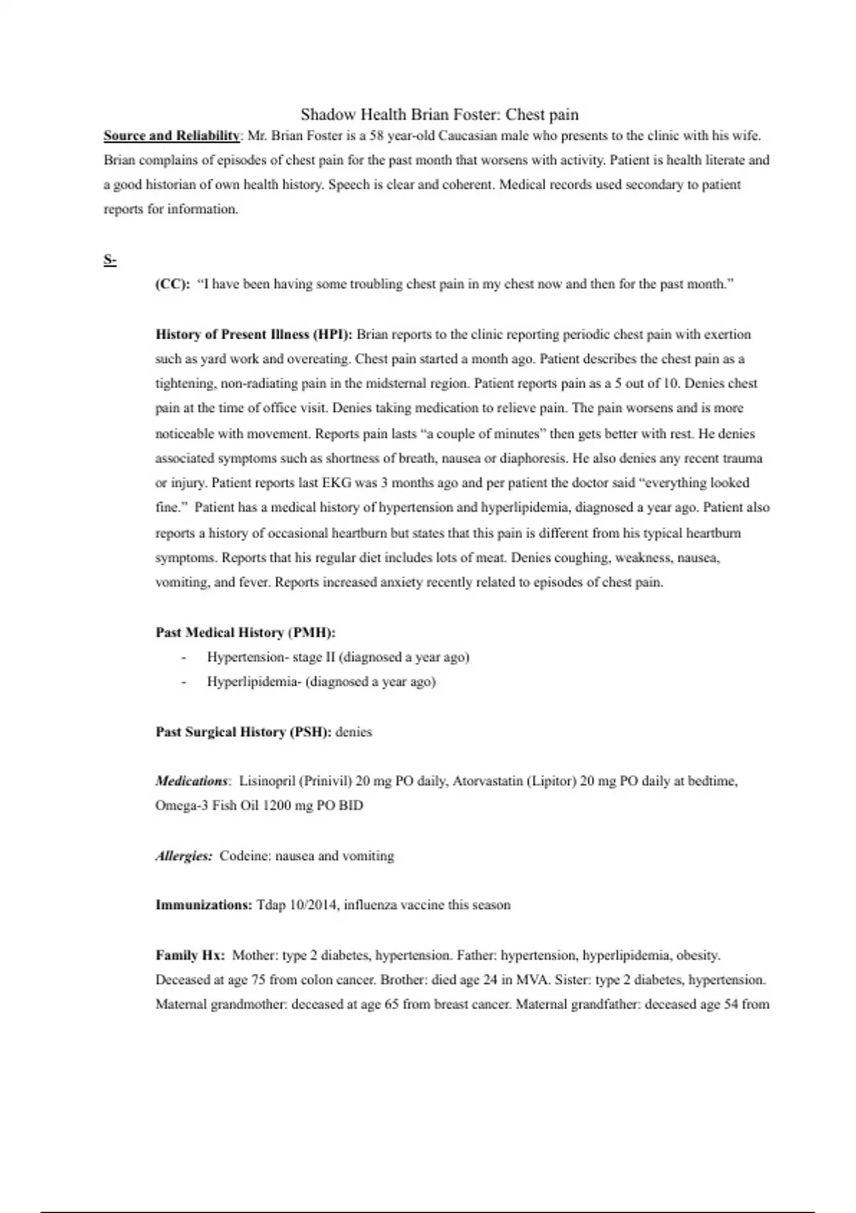 Shadow Health Brain Foster Chest Pain SOAP note