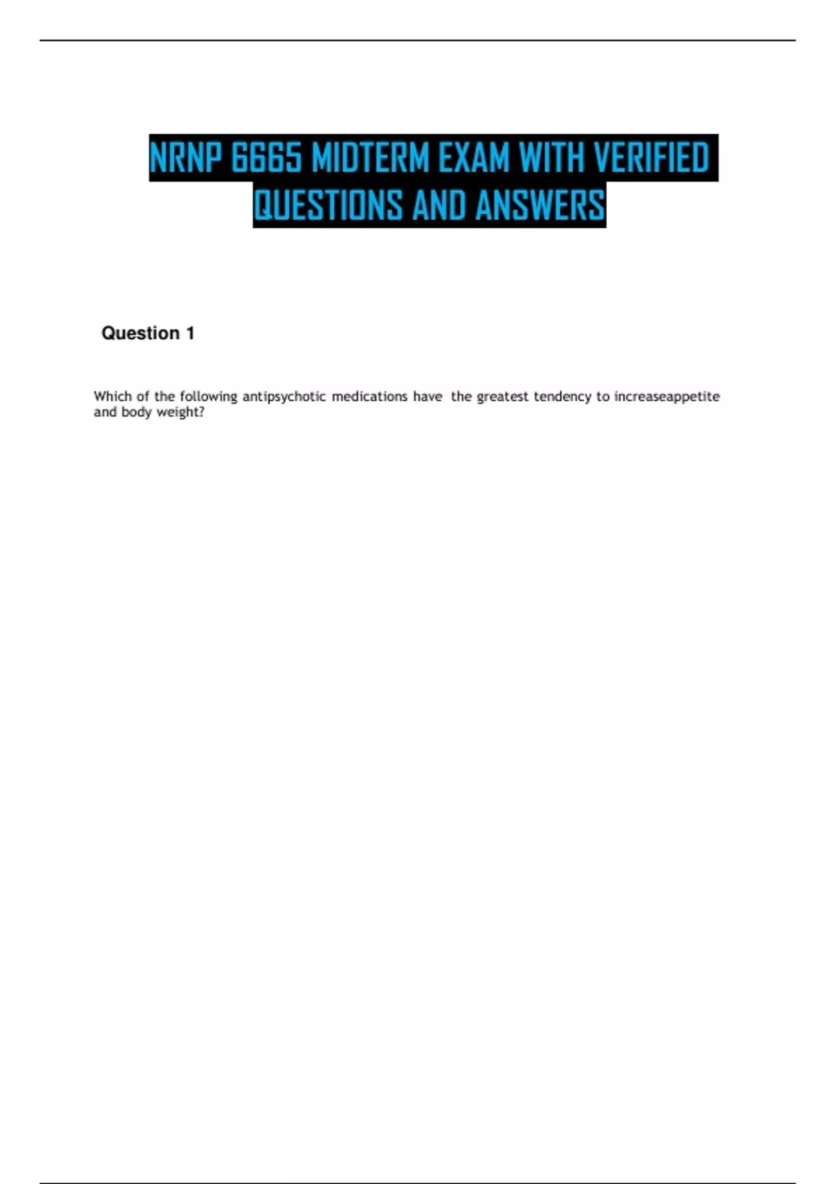 NRNP 6665 MIDTERM EXAM WITH VERIFIED QUESTIONS AND ANSWERS Question 1 Which of the following antipsychotic medications have the greatest tendency to increase appetite and body weight? A Aripiprazole (Abilify) . B Ziprasidone . (Geodon) C Haloperidol (Haldol) . D Risperidone . (Risperdal) Question 2 When assessing a child with disruptive or aggressive behavior, the clinician asks “Have you been thinking about or planning to hurt anyone?” to screen for which of the following diagnostic categories? A Safety . B Bullying . C Conduct disorder . D Oppositional defiant . disorder Question 3 The clinician assessing substance abuse in an adolescent asks, “Did you develop more moodor anxiety problems after you started using?” to screen for which of the following diagnostic possibilities? A Substance use disorder . B Substance withdrawal . C Substance tolerance . D Substance induced mental . disorder Question 4 Biofeedback, deep breathing, mindfulness, and progressive muscle relaxation are strategies that are typically used in which of the following therapies? A Relaxation therapy . B Social skills training . C Motivational . Interviewing D Applied behavioral . analysis Question 5 According to the APA which of the following are required to support a child’s DSM-5 diagnosis? A The child’s clinical presentation fulfills the specific symptom based . diagnostic criteria. B The child’s symptoms are not caused by other diagnoses or stressors. . C The child’s symptoms are impairing a child’s functioning in at least two . settings. D A and B . Question 6 Which of the following is NOT consistent with good sleep hygiene? A Allow child to keep a cell phone at bedside. . B Establish bedtime routines and maintain consistently. . C Limit use of electronics in the evening i.e., television, . computer, etc. D Set and maintain a bedtime that will allow for adequate . sleep. Question 7 When the patient lacks capacity to make a decision the nurse has the ethical responsibilityto do which of the following? A Become a surrogate decision maker for the patient. . B Consult a formally-designated surrogate for patient choices. . C Make safe choices for the patient based on the nurse’s beliefs . and values. D Continue to support all the patient’s choices until a surrogate . can be found. Question 8 When assessing a child who has presented with concerns of being anxious and worried, the provider asks the child “Do you get sudden surges of fear that make your body feel shaky oryour heart race?” to screen for which of the following common diagnostic possibilities? A Obsessive -compulsive . disorder B Posttraumatic stress . disorder C Panic disorder . D Separation anxiety . disorder Question 9 Which of the following antipsychotic medications has the greatest risk for weight gain and lipid changes? A Ziprasidone . (Geodon) B Aripiprazole . (Abilify) C Olanzapine . (Zyprexa) D Quetiapine . (Seroquel) Question 10 A period of at least one week in which both a manic episode and a major depressive episode occur almost daily is consistent with which diagnosis? A Bipolar II Disorder . B Cyclothymic Disorder . The theory that depression results from specific thought distortions is consistent with which of the following? C Bipolar I Disorder, mixed . episode D Bipolar I Disorder, cyclothymic . type Question 11 Which of the following is NOT true about symptomatology of anorexia nervosa? A Most aberrant behaviors directed toward losing weight occurs in secret. . B All patients have an intense fear of gaining weight and becoming obese. . C Most patients with anorexia nervosa will have no difficulty eating with their family in . public places. D Fear of gaining weight and becoming obese frequently contributes to the individual’s . lack of interest in and resistance to therapy/treatment. Question 12 Sleep-related hallucinations occurring at sleep onset are known as which of the following? A Hypnagogic . B Hypnopompic . C Complex . hallucinations D Paranormal . hallucinations Question 13 A Cognitive theory . B Psychosocial theory . C Psychodynamic theory . D Learned helplessness . theory Reasons for the underuse of specific mental health treatments during childhood include which of the following? Which of the following is true regarding the cultural formulation interview with a child and caregiver? According to the APA, “Psychologists seek to promote accuracy, honesty, and truthfulness in the practice of psychology,” reflecting which of the following ethical principles? Question 14 A Stigma associated with mental health . B Poor problem recognition . C Limited availability of mental health . specialists D All of the above . Question 15 A Asking about a child and caregiver’s cultural understanding is an efficient way to . build a therapeutic alliance. B While cultural understanding is important, it is important not to personalize the . diagnosis. C While obtaining cultural information is important, it may increase bias and thus . decrease accuracy of the assessment. D Engaging in a discussion about culture, while interesting and engaging, is a . distraction from the problem that brought the child and caregiver to the provider