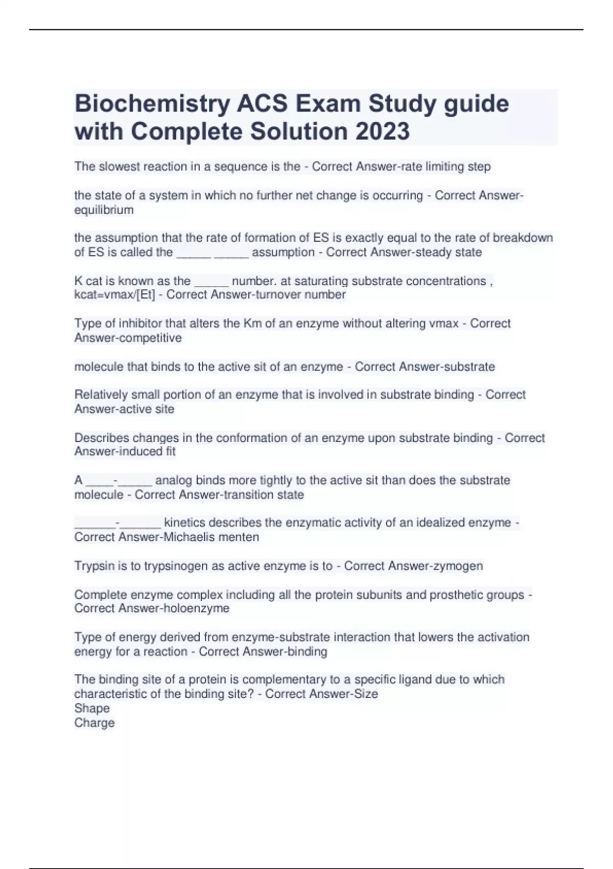 Biochemistry ACS Exam Study guide with Complete Solution