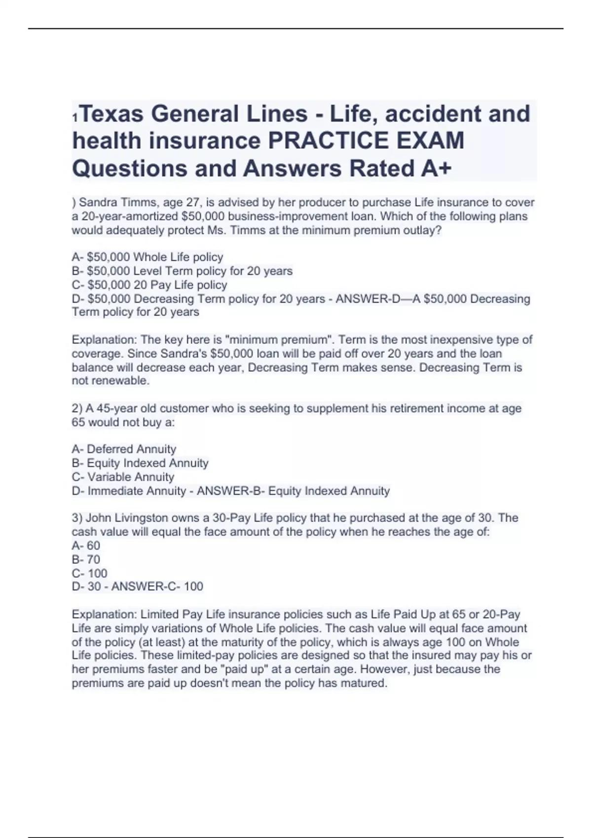 D- 20-Pay Life - ANSWER-D- 20-Pay Life