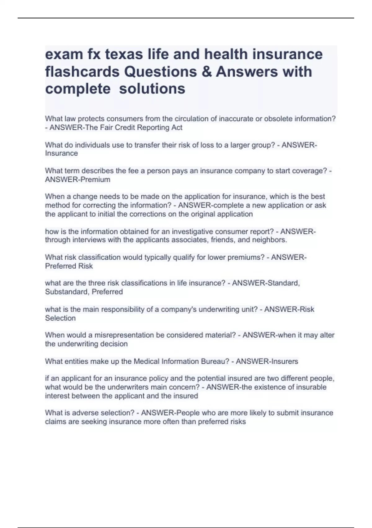 what is insurance underwriting? - ANSWER-the process of risk selection and