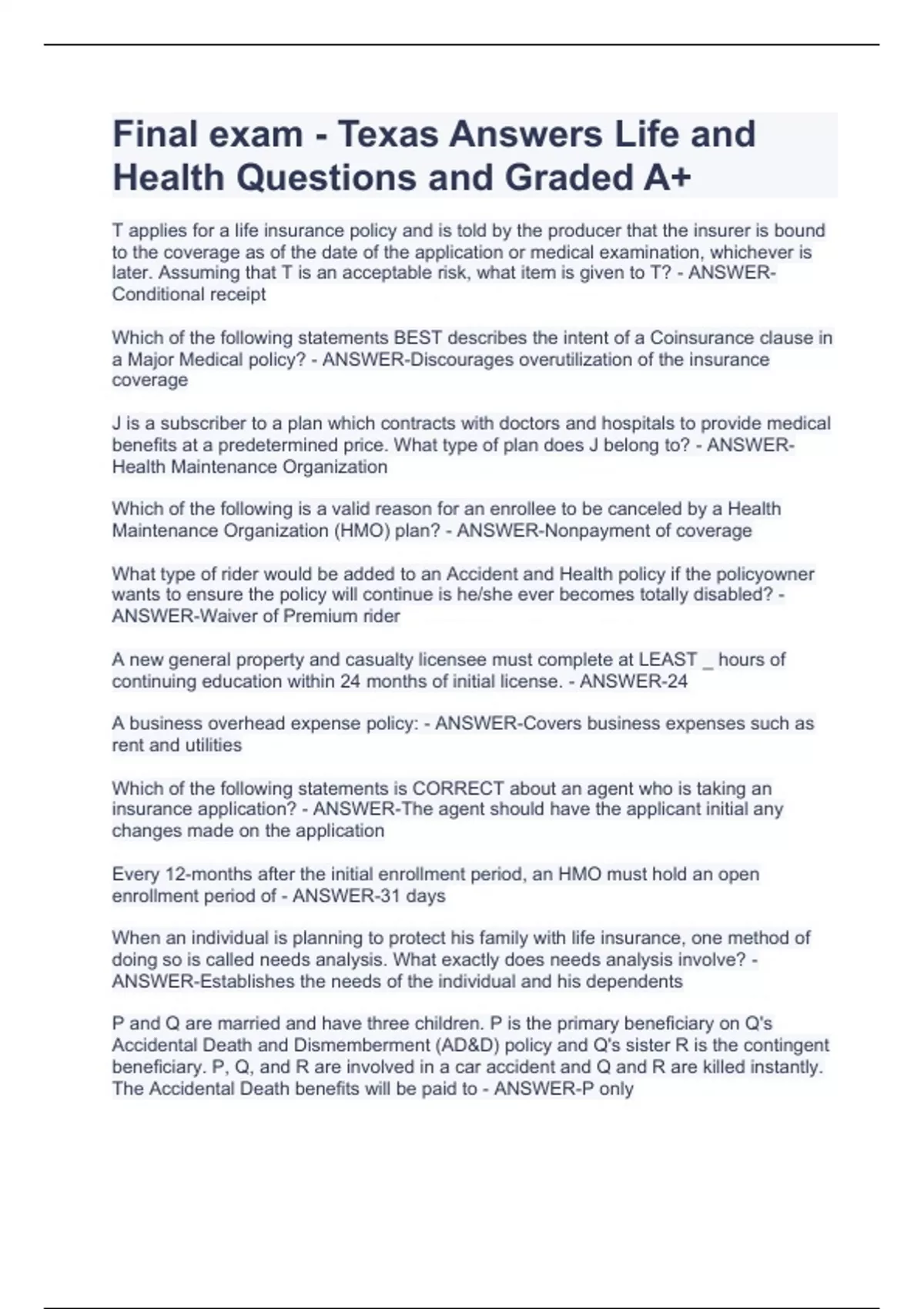 Final exam - Texas Answers Life and Health Questions and Graded A+