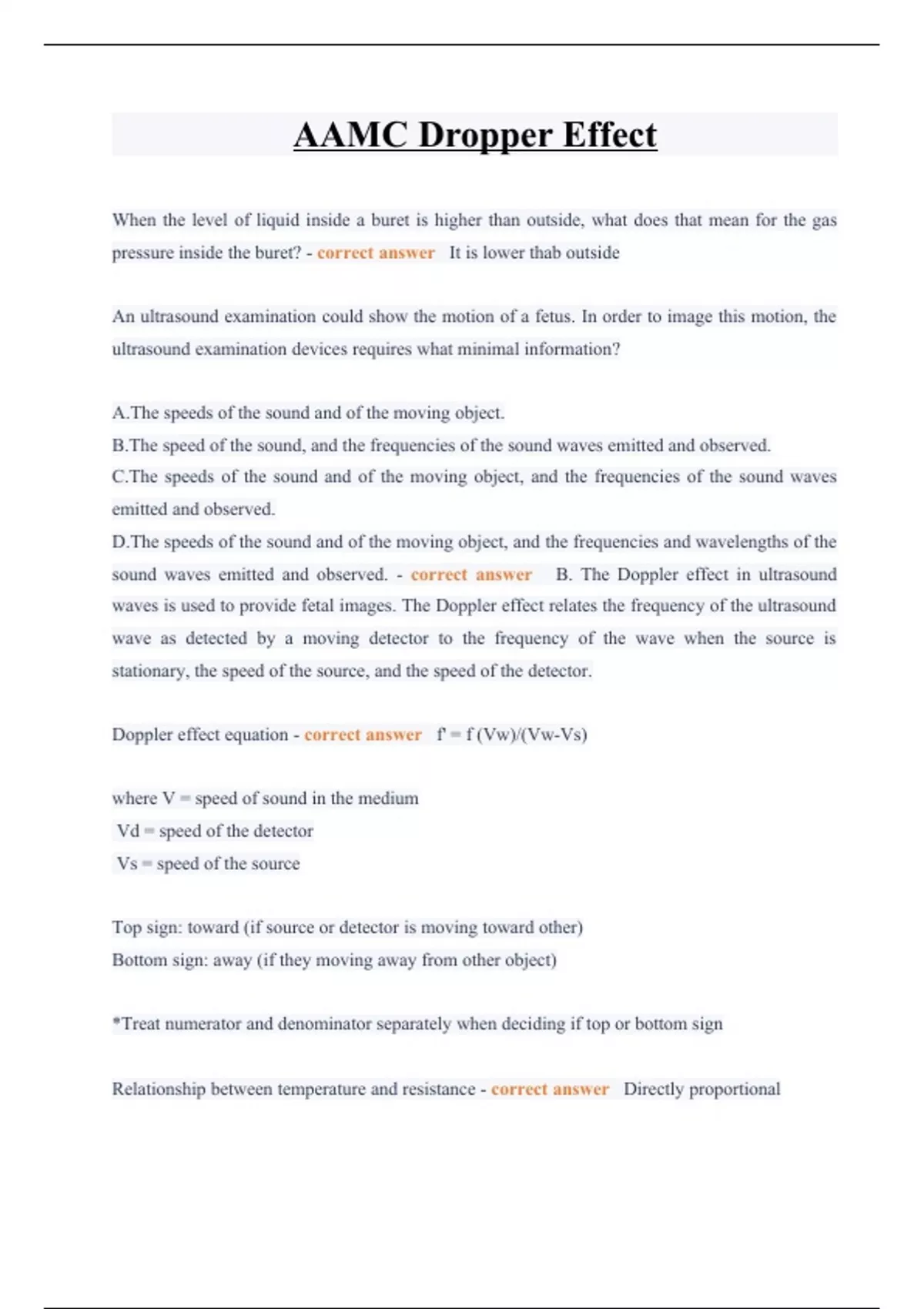 AAMC Dropper Effect questions and answers 2023/2024 When the level of liquid inside a buret is higher than outside, what does that mean for the gas pressure inside the buret? - correct answer It is lower thab outside An ultrasound examination could show the motion of a fetus. In order to image this motion, the ultrasound examination devices requires what minimal information? A.The speeds of the sound and of the moving object. B.The speed of the sound, and the frequencies of the sound waves emitted and observed. C.The speeds of the sound and of the moving object, and the frequencies of the sound waves emitted and observed. D.The speeds of the sound and of the moving object, and the frequencies and wavelengths of the sound waves emitted and observed. - correct answer B. The Doppler effect in ultrasound waves is used to provide fetal images. The Doppler effect relates the frequency of the ultrasound wave as detected by a moving detector to the frequency of the wave when the source is stationary, the speed of the source, and the speed of the detector. Doppler effect equation - correct answer f' = f (Vw)/(Vw-Vs) where V = speed of sound in the medium Vd = speed of the detector Vs = speed of the source Top sign: toward (if source or detector is moving toward other) Bottom sign: away (if they moving away from other object) *Treat numerator and denominator separately when deciding if top or bottom sign Relationship between temperature and resistance - correct answer Directly proportional