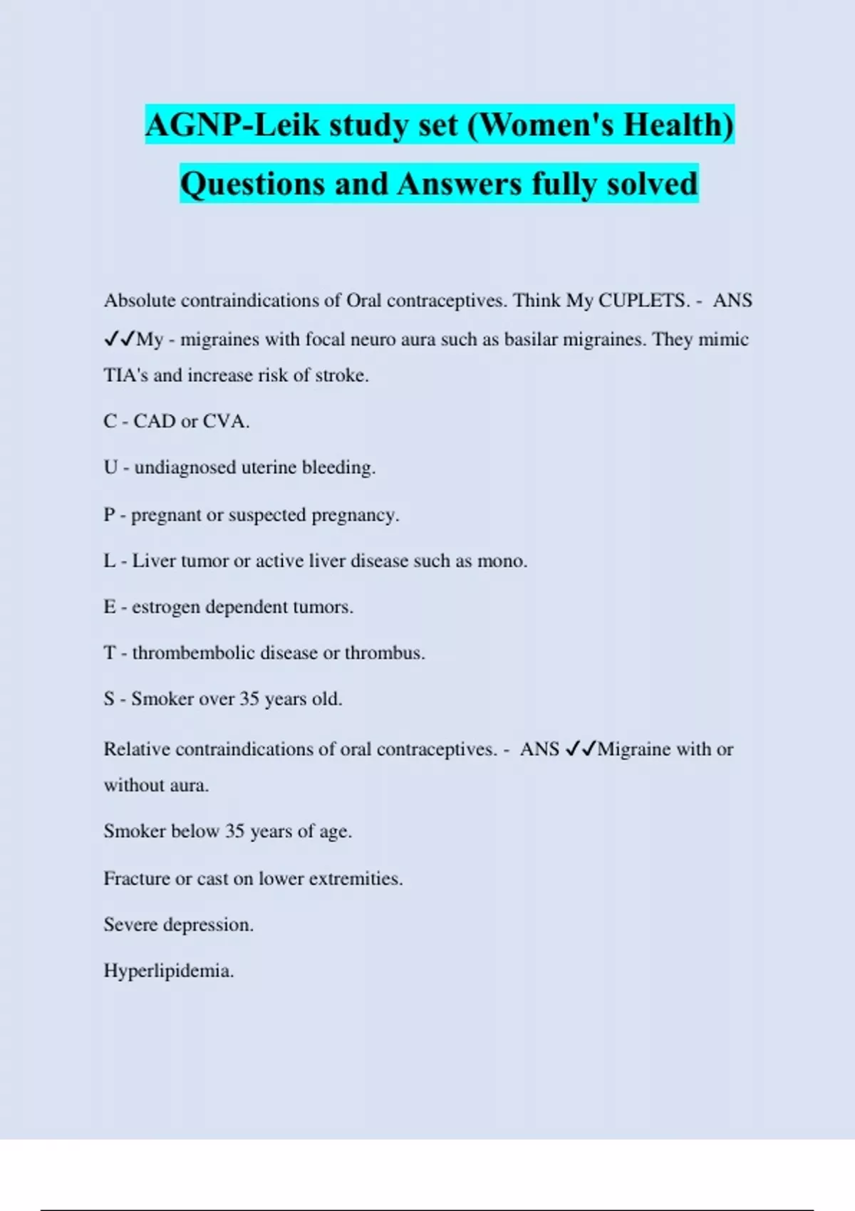 AGNP-Leik study set (Women's Health) Questions and Answers fully solved Absolute contraindications of Oral contraceptives. Think My CUPLETS. - ANS ️️ My - migraines with focal neuro aura such as basilar migraines. They mimic TIA's and increase risk of stroke. C - CAD or CVA. U - undiagnosed uterine bleeding. P - pregnant or suspected pregnancy. L - Liver tumor or active liver disease such as mono. E - estrogen dependent tumors. T - thrombembolic disease or thrombus. S - Smoker over 35 years old. Relative contraindications of oral contraceptives. - ANS ️️ Migraine with or without aura. Smoker below 35 years of age. Fracture or cast on lower extremities. Severe depression. Hyperlipidemia. Advantages of pill after 4-5 years of use. - ANS ️️ Ovarian and endometrial cancers decreased by 40-50%. Decreased dysmenorrhea/cramps. (decrease in prostaglandins) Decreased incidence of PID due to thickened cervical mucous plug. Decreased iron deficiency anemia due to less blood loss from lighter periods. More advantages of pill after 4-5 years of use. - ANS ️️ Decrease acne and hirsutism due to lower levels of androgenic hormones. Decreased ovarian cysts due to suppression of ovulation. Decreased heavy and/or irregular periods due to suppression of ovaries. Unscheduled bleeding/spotting - ANS ️️ May have spotting or light bleeding within first few weeks of starting birth control pills. Use backup method of contraception (condoms) for first two weeks of starting any birth control. Dont switch brands in first 3 months due to spotting. Most cases resolve in 3 months. Menstrual cramps - ANS ️️ Treated with NSAIDS which decreases pain and bleeding by suppressing prostaglandins Endometriosis - ANS ️️ Heavy menstrual bleeding (menorrhagia) with severe cramping in younger wom
