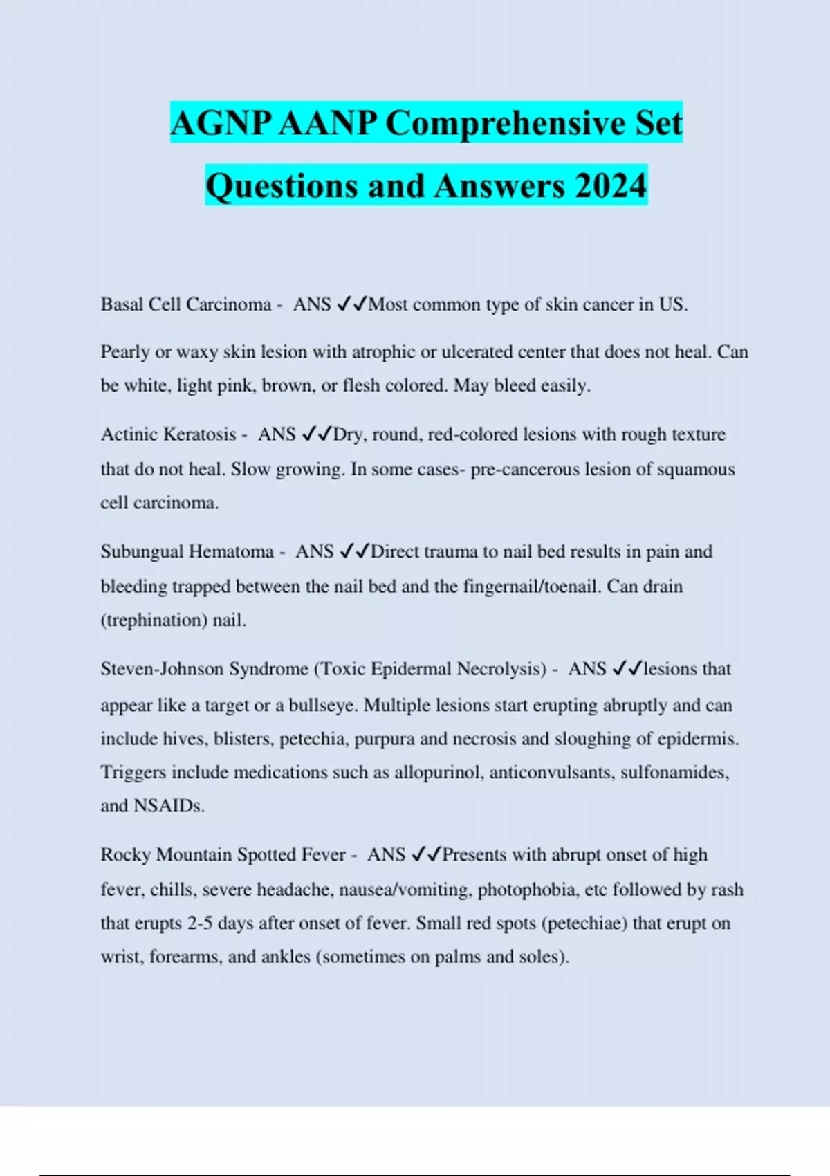 AGNP AANP Comprehensive Set Questions and Answers 2024 Basal Cell Carcinoma - ANS ️️ Most common type of skin cancer in US. Pearly or waxy skin lesion with atrophic or ulcerated center that does not heal. Can be white, light pink, brown, or flesh colored. May bleed easily. Actinic Keratosis - ANS ️️ Dry, round, red-colored lesions with rough texture that do not heal. Slow growing. In some cases- pre-cancerous lesion of squamous cell carcinoma. Subungual Hematoma - ANS ️️ Direct trauma to nail bed results in pain and bleeding trapped between the nail bed and the fingernail/toenail. Can drain (trephination) nail. Steven-Johnson Syndrome (Toxic Epidermal Necrolysis) - ANS ️️ lesions that appear like a target or a bullseye. Multiple lesions start erupting abruptly and can include hives, blisters, petechia, purpura and necrosis and sloughing of epidermis. Triggers include medications such as allopurinol, anticonvulsants, sulfonamides, and NSAIDs. Rocky Mountain Spotted Fever - ANS ️️ Presents with abrupt onset of high fever, chills, severe headache, nausea/vomiting, photophobia, etc followed by rash that erupts 2-5 days after onset of fever. Small red spots (petechiae) that erupt on wrist, forearms, and ankles (sometimes on palms and soles). Tuberculosis - ANS ️️ Positive result can be 5 mm. Chest X-ray may show cavitation that are usually located in upper lobes. The skin induration is the best indicator of a positive Mantoux result Cough lasting 3 weeks or longer. Pleuritic chest pain. Hempotysis with fatigue, weight loss, anorexia, fever/chills, night sweats. Mitral Area - ANS ️️ Best location to auscultate S3 heart sound. Left lateral recumbent position brings the apex closer to the wall and improves practitioners ability to hear the