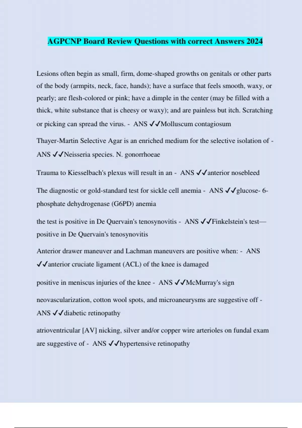 AGPCNP Board Review Questions with correct Answers 2024 Lesions often begin as small, firm, dome-shaped growths on genitals or other parts of the body (armpits, neck, face, hands); have a surface that feels smooth, waxy, or pearly; are flesh-colored or pink; have a dimple in the center (may be filled with a thick, white substance that is cheesy or waxy); and are painless but itch. Scratching or picking can spread the virus. - ANS ️️ Molluscum contagiosum Thayer-Martin Selective Agar is an enriched medium for the selective isolation of - ANS ️️ Neisseria species. N. gonorrhoeae Trauma to Kiesselbach's plexus will result in an - ANS ️️ anterior nosebleed The diagnostic or gold-standard test for sickle cell anemia - ANS ️️ glucose- 6- phosphate dehydrogenase (G6PD) anemia the test is positive in De Quervain's tenosynovitis - ANS ️️ Finkelstein's test— positive in De Quervain's tenosynovitis Anterior drawer maneuver and Lachman maneuvers are positive when: - ANS ️️ anterior cruciate ligament (ACL) of the knee is damaged positive in meniscus injuries of the knee - ANS ️️ McMurray's sign neovascularization, cotton wool spots, and microaneurysms are suggestive off - ANS ️️ diabetic retinopathy atrioventricular [AV] nicking, silver and/or copper wire arterioles on fundal exam are suggestive of - ANS ️️ hypertensive retinopathy