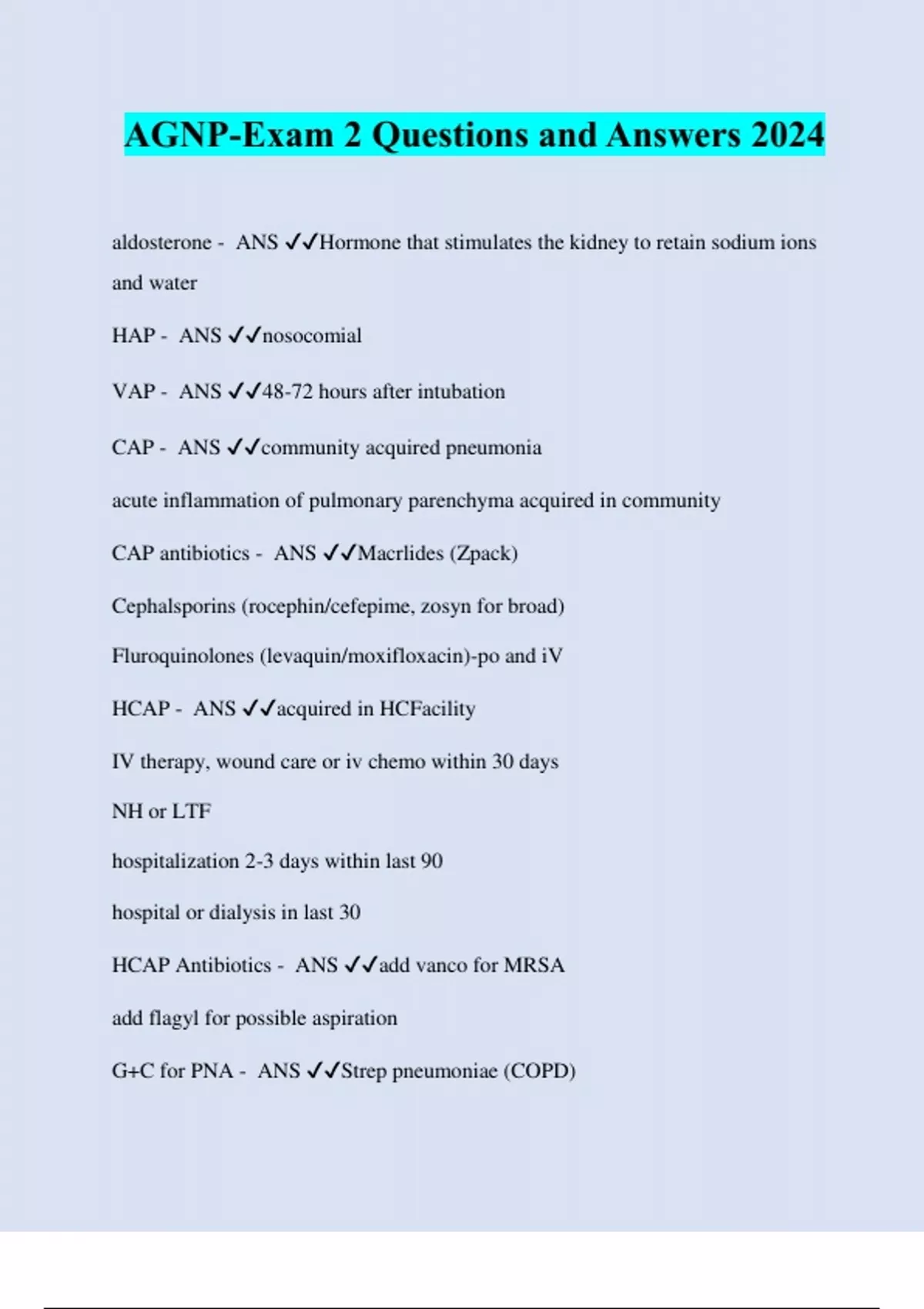 AGNP-Exam 2 Questions and Answers 2024 aldosterone - ANS ️️ Hormone that stimulates the kidney to retain sodium ions and water HAP - ANS ️️ nosocomial VAP - ANS ️️ 48-72 hours after intubation CAP - ANS ️️ community acquired pneumonia acute inflammation of pulmonary parenchyma acquired in community CAP antibiotics - ANS ️️ Macrlides (Zpack) Cephalsporins (rocephin/cefepime, zosyn for broad) Fluroquinolones (levaquin/moxifloxacin)-po and iV HCAP - ANS ️️ acquired in HCFacility IV therapy, wound care or iv chemo within 30 days NH or LTF hospitalization 2-3 days within last 90 hospital or dialysis in last 30 HCAP Antibiotics - ANS ️️ add vanco for MRSA add flagyl for possible aspiration G+C for PNA - ANS ️️ Strep pneumoniae (COPD)