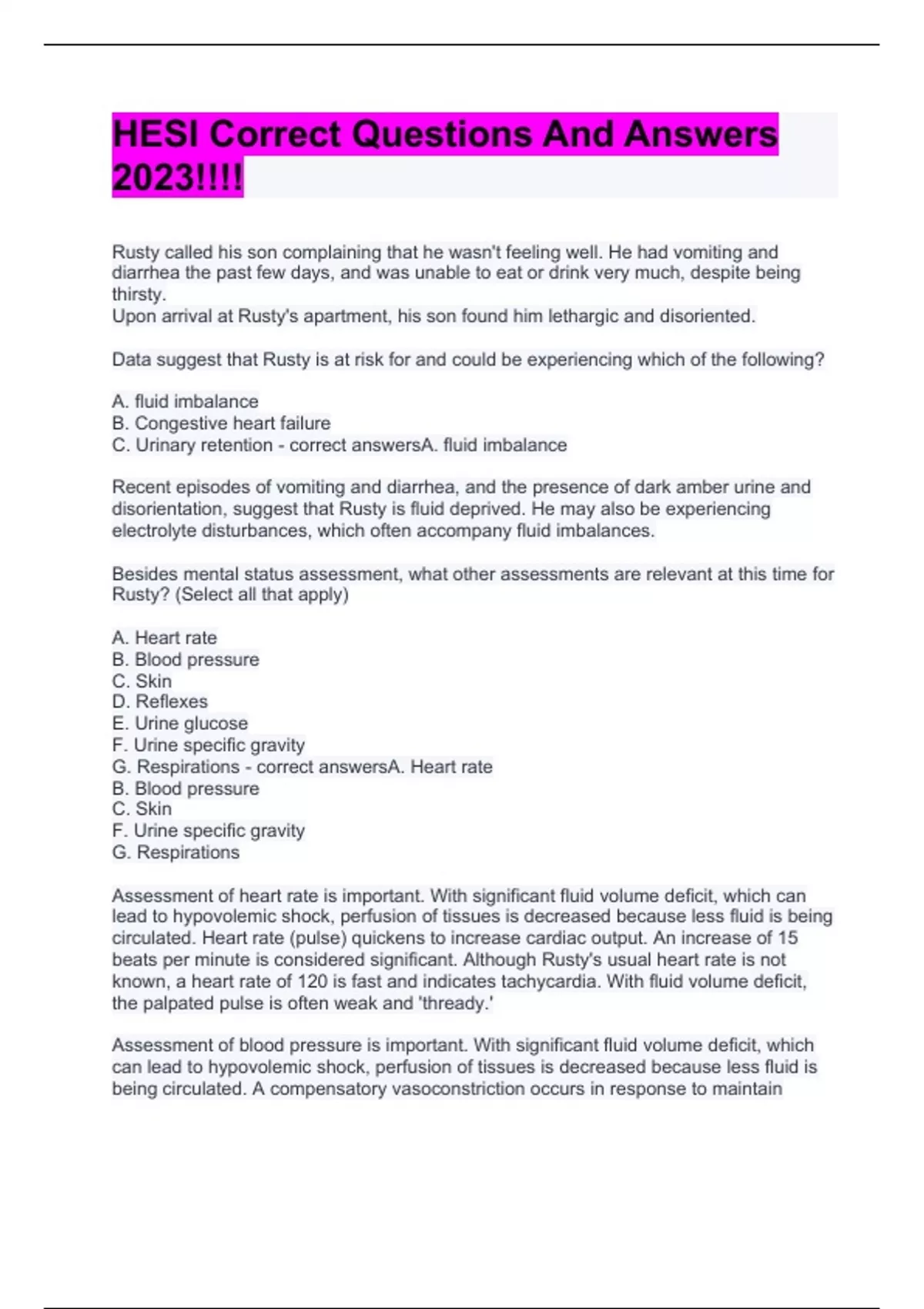HESI Correct Questions And Answers 2023/2024Rusty called his son complaining that he wasn't feeling well. He had vomiting and diarrhea the past few days, and was unable to eat or drink very much, despite being thirsty. Upon arrival at Rusty's apartment, his son found him lethargic and disoriented. Data suggest that Rusty is at risk for and could be experiencing which of the following? A. fluid imbalance B. Congestive heart failure C. Urinary retention - correct answersA. fluid imbalance Recent episodes of vomiting and diarrhea, and the presence of dark amber urine and disorientation, suggest that Rusty is fluid deprived. He may also be experiencing electrolyte disturbances, which often accompany fluid imbalances.