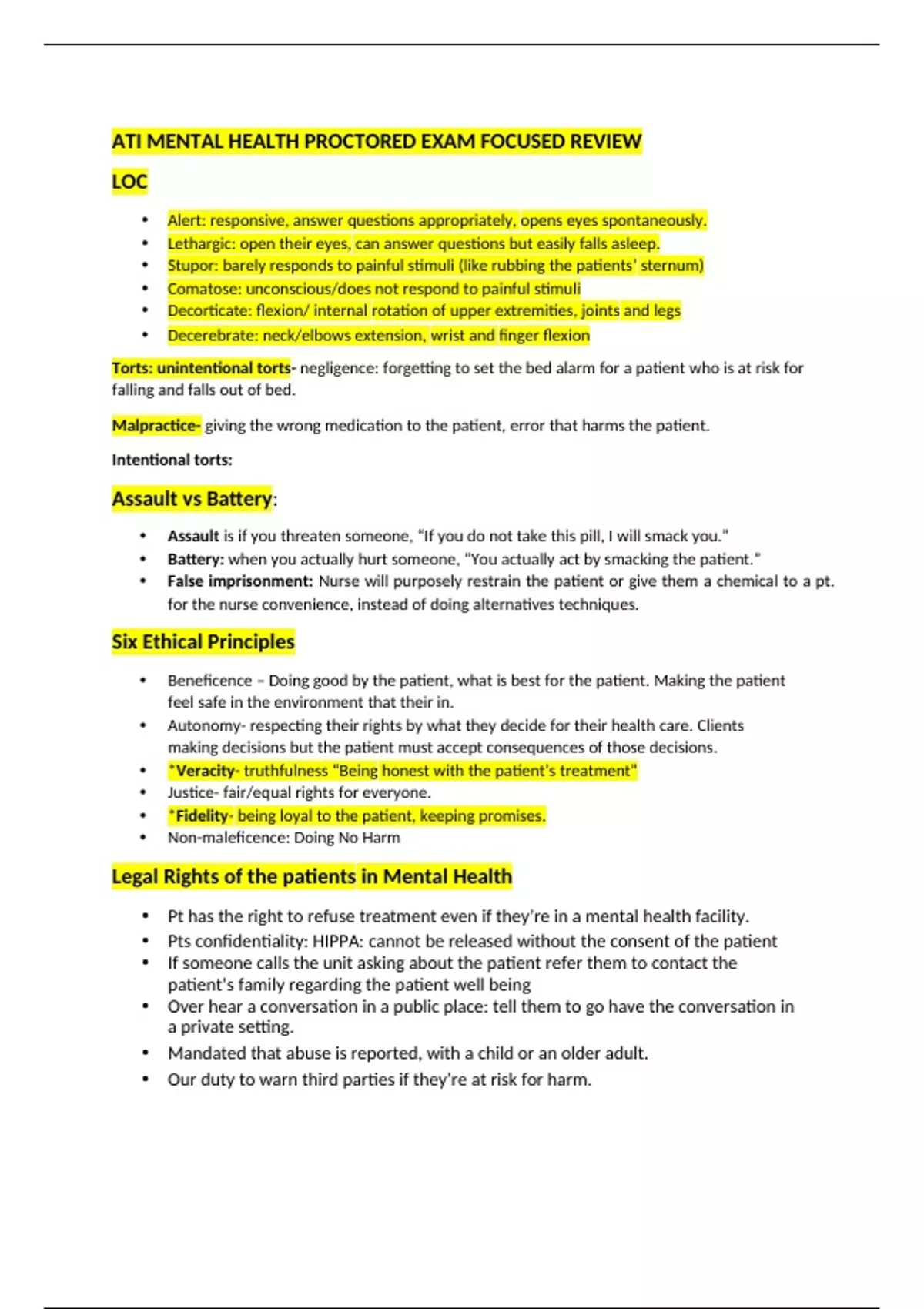 ATI MENTAL HEALTH PROCTORED EXAM FOCUSED REVIEW LOC • Alert: responsive, answer questions appropriately, opens eyes spontaneously. • Lethargic: open their eyes, can answer questions but easily falls asleep. • Stupor: barely responds to painful stimuli (like rubbing the patients’ sternum) • Comatose: unconscious/does not respond to painful stimuli • Decorticate: flexion/ internal rotation of upper extremities, joints and legs • Decerebrate: neck/elbows extension, wrist and finger flexion Torts: unintentional torts- negligence: forgetting to set the bed alarm for a patient who is at risk for falling and falls out of bed. Malpractice- giving the wrong medication to the patient, error that harms the patient. Intentional torts: Assault vs Battery: • Assault is if you threaten someone, “If you do not take this pill, I will smack you.” • Battery: when you actually hurt someone, “You actually act by smacking the patient.” • False imprisonment: Nurse will purposely restrain the patient or give them a chemical to a pt. for the nurse convenience, instead of doing alternatives techniques. Six Ethical Principles • Beneficence – Doing good by the patient, what is best for the patient. Making the patient feel safe in the environment that their in. • Autonomy- respecting their rights by what they decide for their health care. Clients making decisions but the patient must accept consequences of those decisions. • *Veracity- truthfulness “Being honest with the patient’s treatment” • Justice- fair/equal rights for everyone. • *Fidelity- being loyal to the patient, keeping promises. • Non-maleficence: Doing No Harm Legal Rights of the patients in Mental Health • Pt has the right to refuse treatment even if they’re in a mental health facility. • Pts confidentiality: HIPPA: cannot be released without the consent of the patient • If someone calls the unit asking about the patient refer them to contact the patient’s family regarding the patient well being • Over hear a conversation in a public place: tell them to go have the conversation in a private setting. • Mandated that abuse is reported, with a child or an older adult. • Our duty to warn third parties if they’re at risk for harm. Informed Consent: Provider: • Communicate the purpose of the procedure • Give a clear description of the procedure in the patient primary language. • Explain the risks vs the benefits • Other options in treating the condition RN Role: • make sure the provider gives this information to the patient. • Pt is competent in receiving the information, they must be an adult or an emancipated child, THERE CAN BE NO IMPAIRMENTS! • If they do not understand the information then we do not answer the questions, have the provider answer the questions. Restraints: • Physical- vest, belt, and mittens. LAST RESORT • Chemical- sedative/antipsychotic medications • Alternatives before restraints: verbal interventions, calm/quiet environment, diversions. • Prescriptions must be written • Write an order for restraints to be placed on patient. If the orders need to be renewed it has to be renewed within 24 hours. • Care for the Patient: • Assessing the patient vital signs q 15 mins • Offer them food and fluid- Every hour • Make sure they get the chance to toilet- Every hour • Monitor vital signs. Emergency Restraints Placed: • get an order from the doctor within 15-30 mins • Time limits: 18 and older: 4 hours, 9-17: 2 hours, 8 and under= 1-hour, extra documentation: event that caused the restraints to be placed, alternative interventions that were attempted, time treatment began, med administered, patient assessment including current behavior, v/s, pain. Pts care provided: food, helping them to the bathroom. Therapeutic Communication: • *Always try to get more information from the patient. You never want to shut down communication between you and the patient. *“Always go for tell me more response” • Intrapersonal communication: self-talk, thinking thoughts, not verbalizing them. • Interpersonal communication: one on one communication with another person. • Open ended questions: promote interactive discussions “Tell me more, can you share more about x y,z • Closed ended= when looking for a specific answer/ Medical History. Yes/no answers Clarifying techniques: Restating = repeating back the patient exact words Reflecting= returning focus back to the patient Paraphrasing = restating the patients’ feelings and thoughts to confirm what has been communicated. “What I think I hear you saying is this” Exploring= gathering more information about something that the patient has mentioned. “You mentioned this can you tell me little more about that.” General leads= allows the patient to guide the discussion *Presenting reality= focus on what is actually happening to stop the hallucination, delusions, faulty beliefs. “Must be really scary to hear voices can you tell me what their saying” Offering self: demonstrates a willingness to spend time, and the nurse has a genuine concern. Barriers: • Do not offer personal opinions: Never say “ You should do this” • Do not give advice • Do not give false reassurance. • *NEVER ASK WHY! • Never offer value judgements • Don’t do excessive questioning. • Respond approvingly or disapprovingly • Always stay neutral while talking. “ I know exactly how you feel” Never say this! Best Practices when working with older adults: Minimize distractions, discuss health in a private setting, face the patient when speaking, use a low-pitched voice, in the beginning of the interview identify the concerns/needs of the patient, limit the number of items on the questionnaire,* give the patient plenty of time to respond to questions when gathering data* ....................................................................................................CON TINUE.