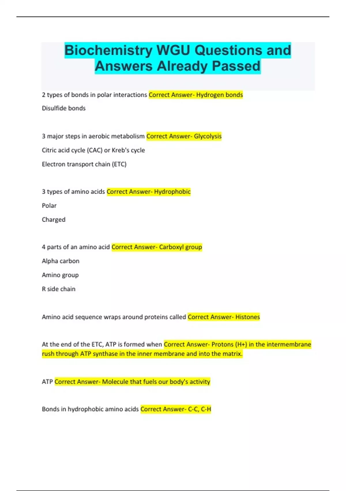 2 types of bonds in polar interactions Correct Answer- Hydrogen bonds Disulfide bonds 3 major steps in aerobic metabolism Correct Answer- Glycolysis Citric acid cycle (CAC) or Kreb's cycle Electron transport chain (ETC) 3 types of amino acids Correct Answer- Hydrophobic Polar Charged 4 parts of an amino acid Correct Answer- Carboxyl group Alpha carbon Amino group R side chain