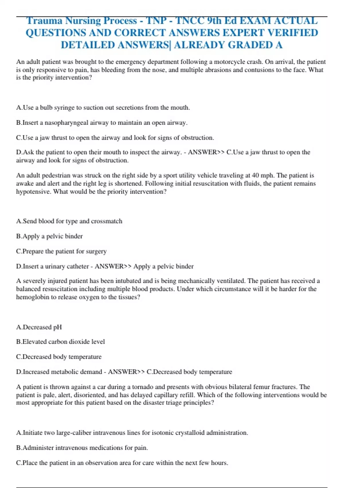 Trauma Nursing Process - TNP - TNCC 9th Ed EXAM ACTUAL QUESTIONS AND CORRECT ANSWERS EXPERT VERIFIED DETAILED ANSWERS ALREADY GRADED A.