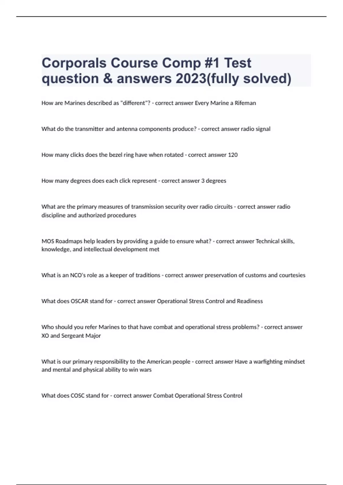 Corporals Course Comp 1 Test question & answers 2023/2024(fully solved)How are Marines described as "different"? - correct answer Every Marine a Rifeman What do the transmitter and antenna components produce? - correct answer radio signal How many clicks does the bezel ring have when rotated - correct answer 120 How many degrees does each click represent - correct answer 3 degrees What are the primary measures of transmission security over radio circuits - correct answer radio discipline and autho