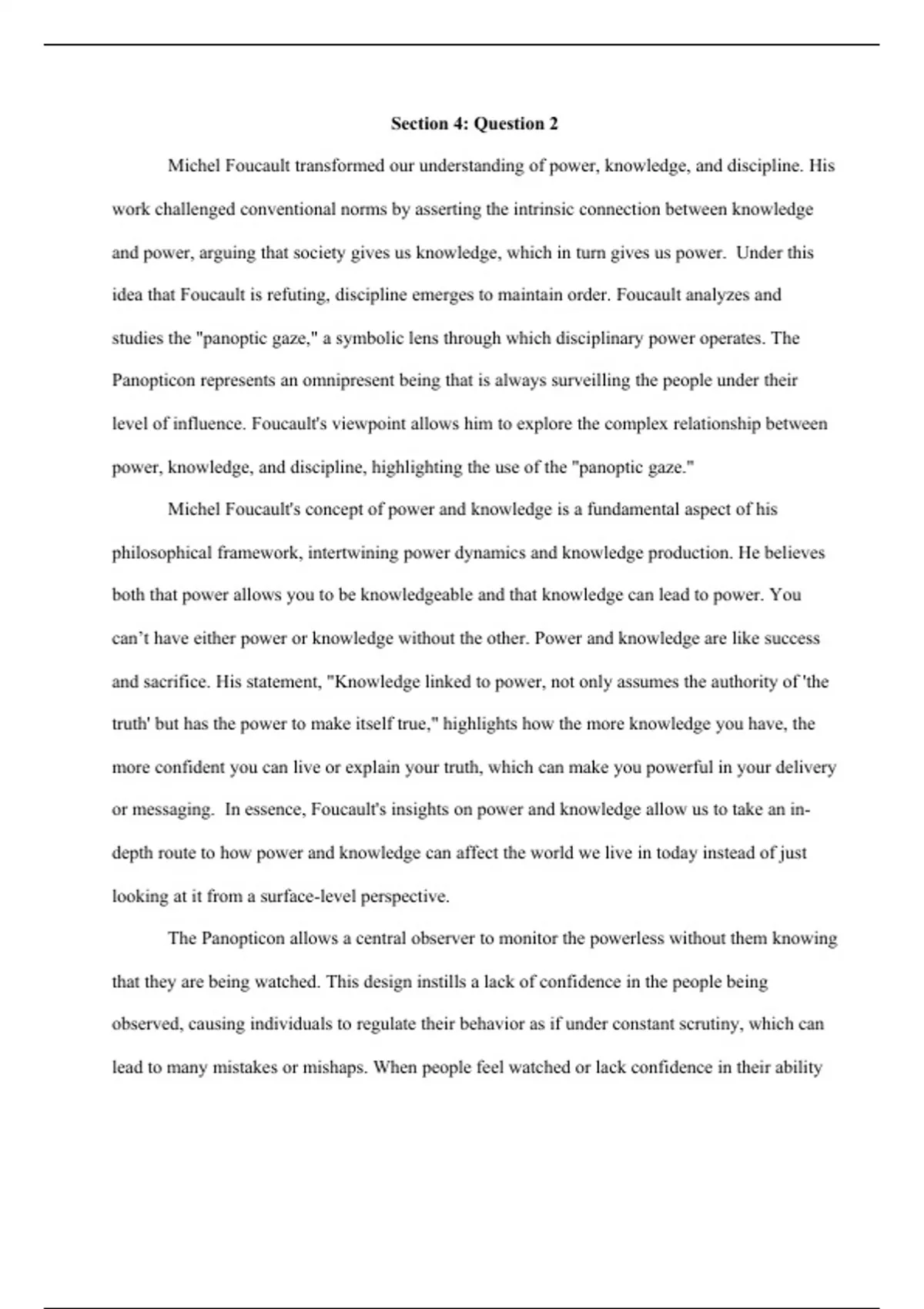 What is the relationship between Power, Knowledge, and Discipline for Foucault? Using an example of the “panoptic gaze” from your own institutional life, explain how subjects are disciplined and punished? What does resistance look like in these systems?