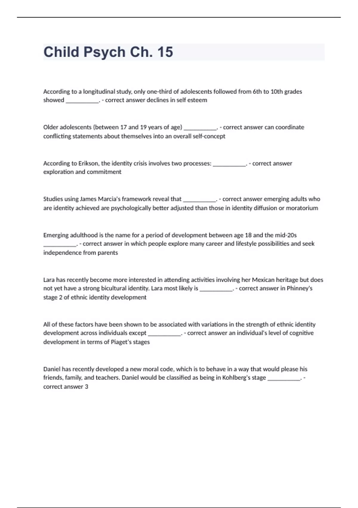 Child Psych Ch. 15 Questions with complete solution 2023/2024According to a longitudinal study, only one-third of adolescents followed from 6th to 10th grades showed __________. - correct answer declines in self esteem Older adolescents (between 17 and 19 years of age) __________. - correct answer can coordinate conflicting statements about themselves into an overall self-concept According to Erikson, the identity crisis involves two processes: __________. - correct answer exploration and commitment Studies using James Marcia's framework reveal that __________. - correct answer emerging adults who are identity achieved are psy